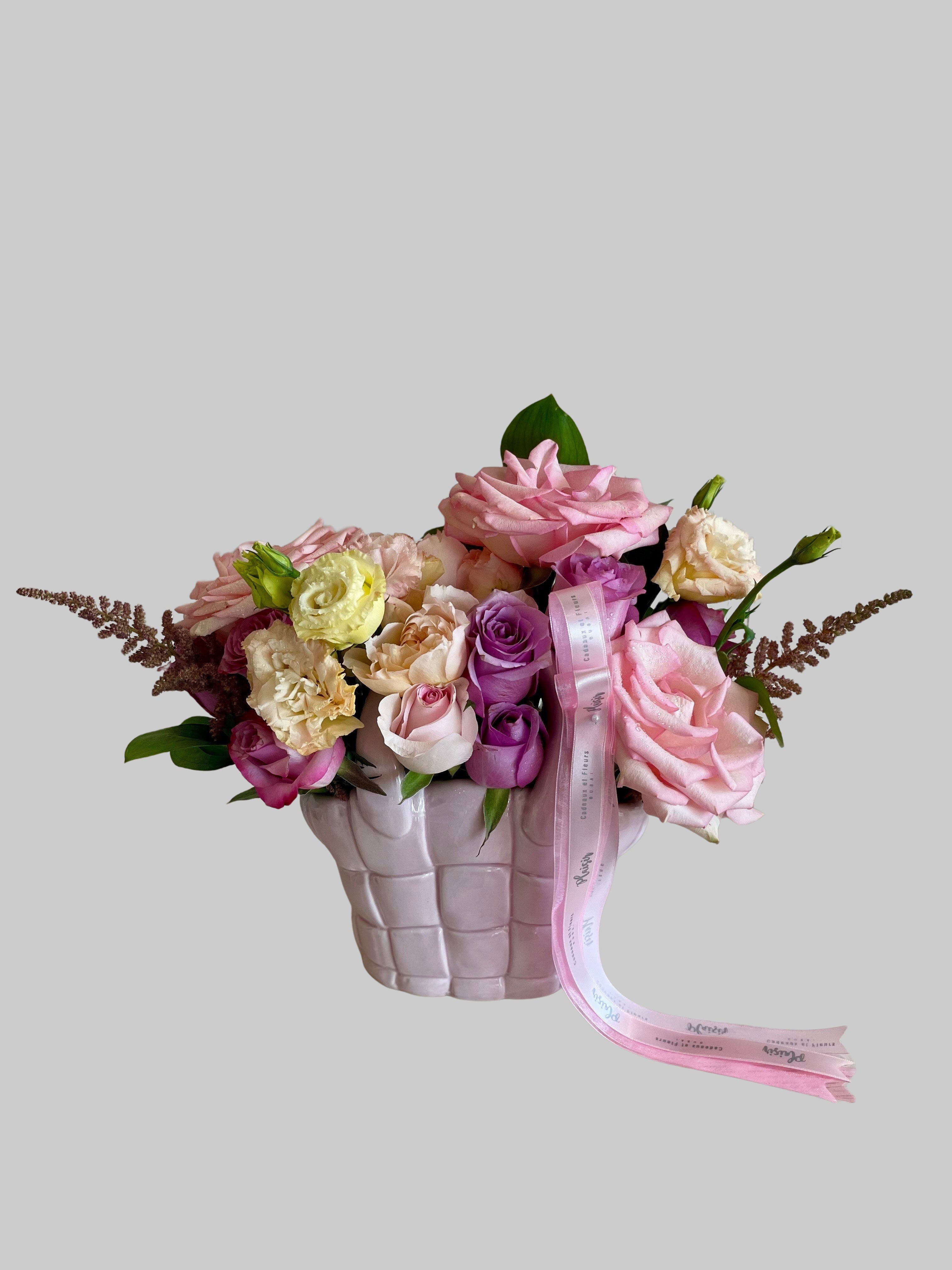 The most adorable flower arrangement set in a unique ceramic handbag. Surprise her with this cute and thoughtful gift!