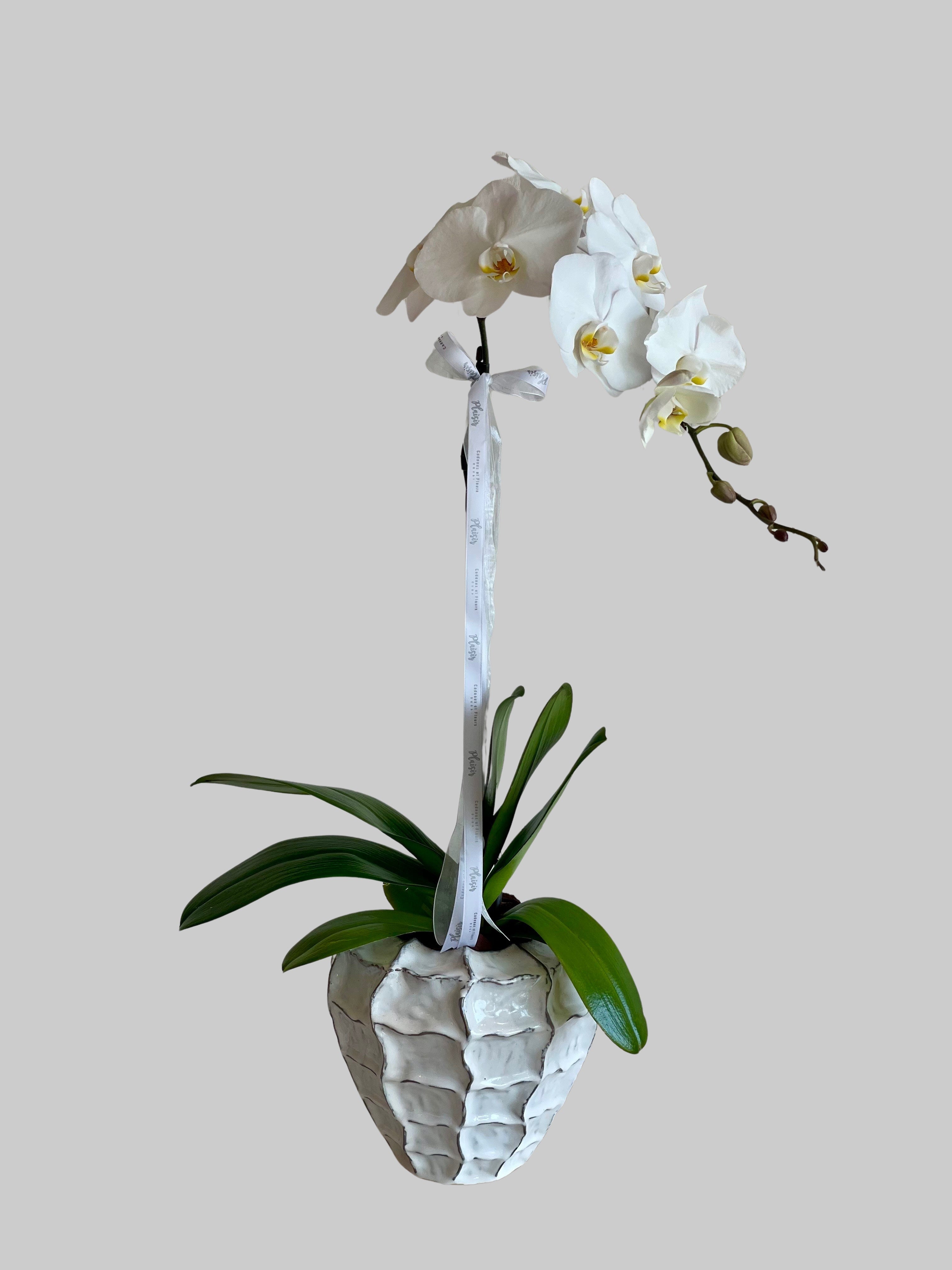 A gorgeous and luxurious single orchid, set in a uniquely designed white ceramic vase. A gift suitable for both ladies and gentlemen, home or office. Orchids are the most popular bloom to decorate any space!