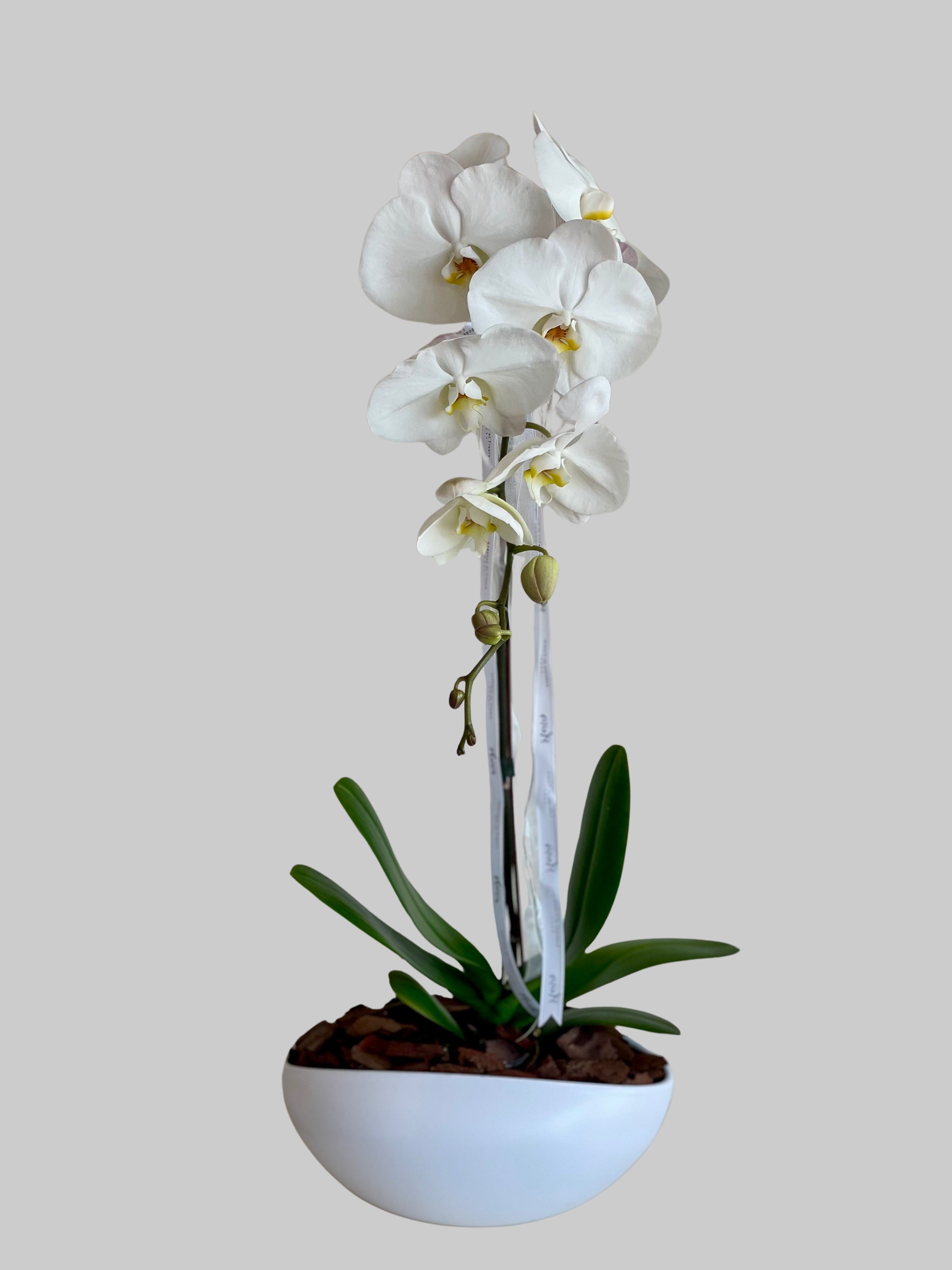 A gorgeous and luxurious single orchid, set in a uniquely designed white oval vase. A gift suitable for both ladies and gentlemen, home or office. Orchids are the most popular bloom to decorate any space!