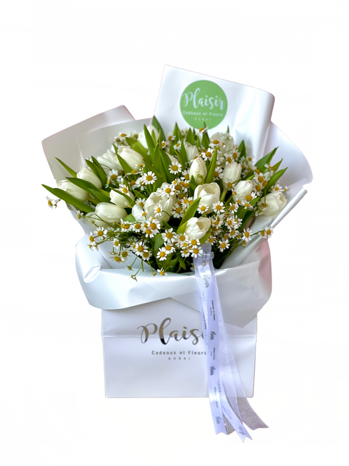 عندما تريد إرسال باقة أنيقة في مزهرية زجاجية، فلا يوجد ما هو أجمل من اللون الأبيض والأخضر. الورود البيضاء والأزهار البيضاء الموسمية إلى جانب ساق فاخرة من زهرة الأوركيد السيمبيديوم تجعل هذه الباقة ليست فريدة فحسب، بل رائعة وفاخرة. (مزهرية زجاجية قطرها 10 سم...- AED. 730.00