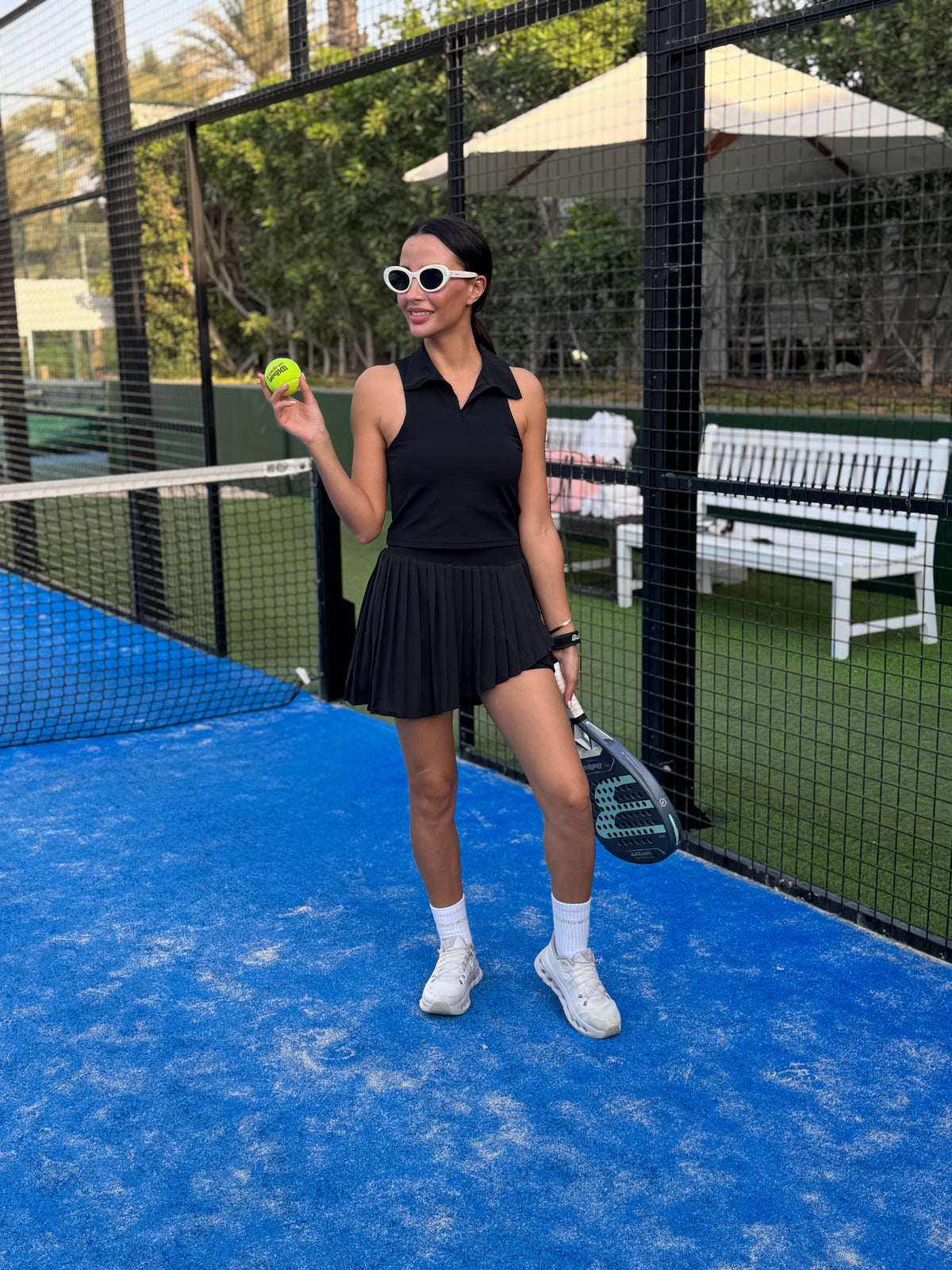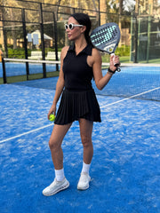 A classic design with a pleated asymmetric skirt, this gorgeous black two-piece padel/tennis top and skort is the ultimate combination of style and comfort.
