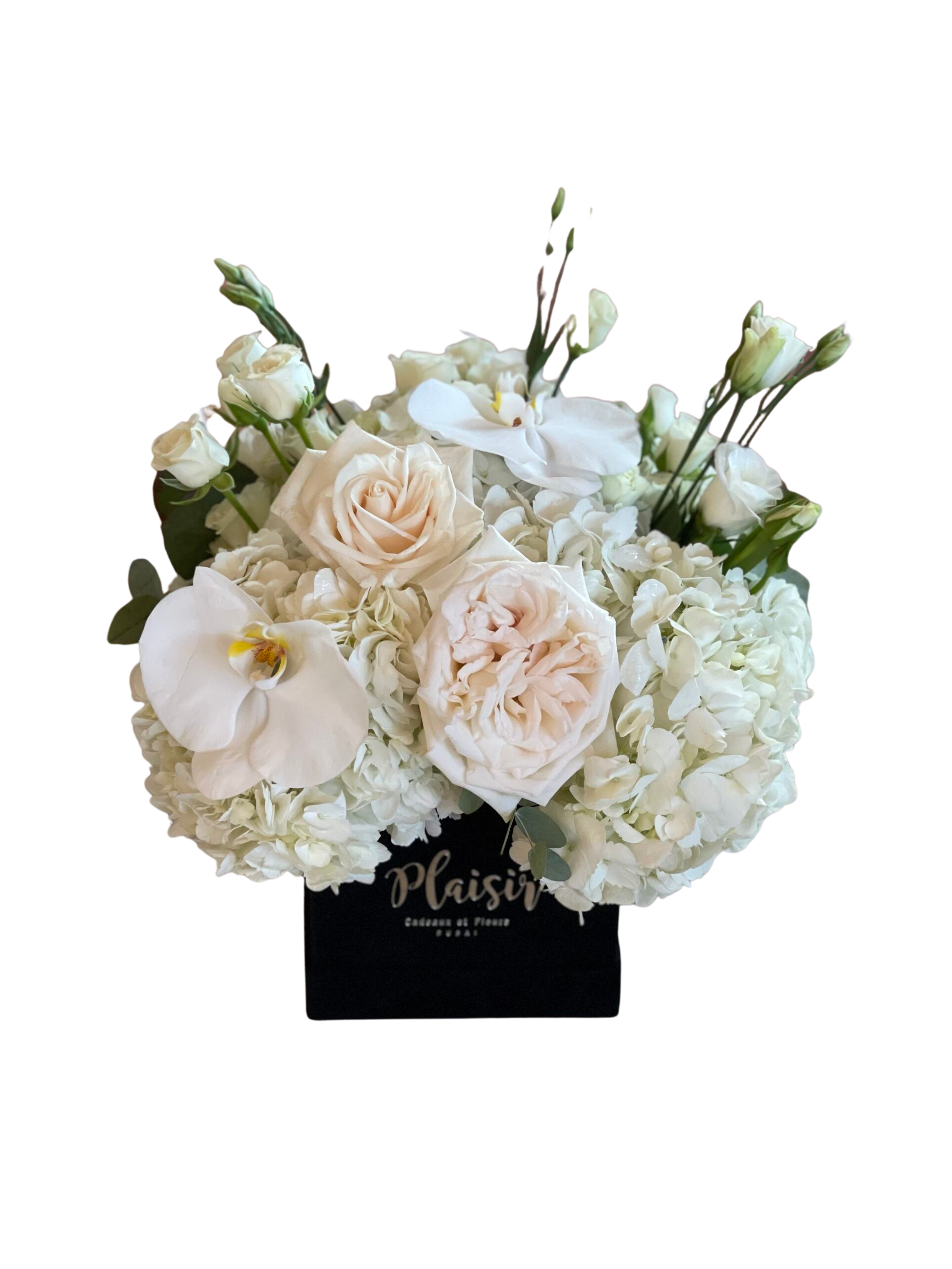 ترتيب جميل باللون الأبيض بالكامل في صندوق مخملي أسود أنيق، مكون من زهور الكوبية والورود والأزهار الموسمية وأزهار الأوركيد - مهما كانت المناسبة، فإن هذا الترتيب سينقل المشاعر الصحيحة! مناسب للسيدات والسادة على حد سواء.
