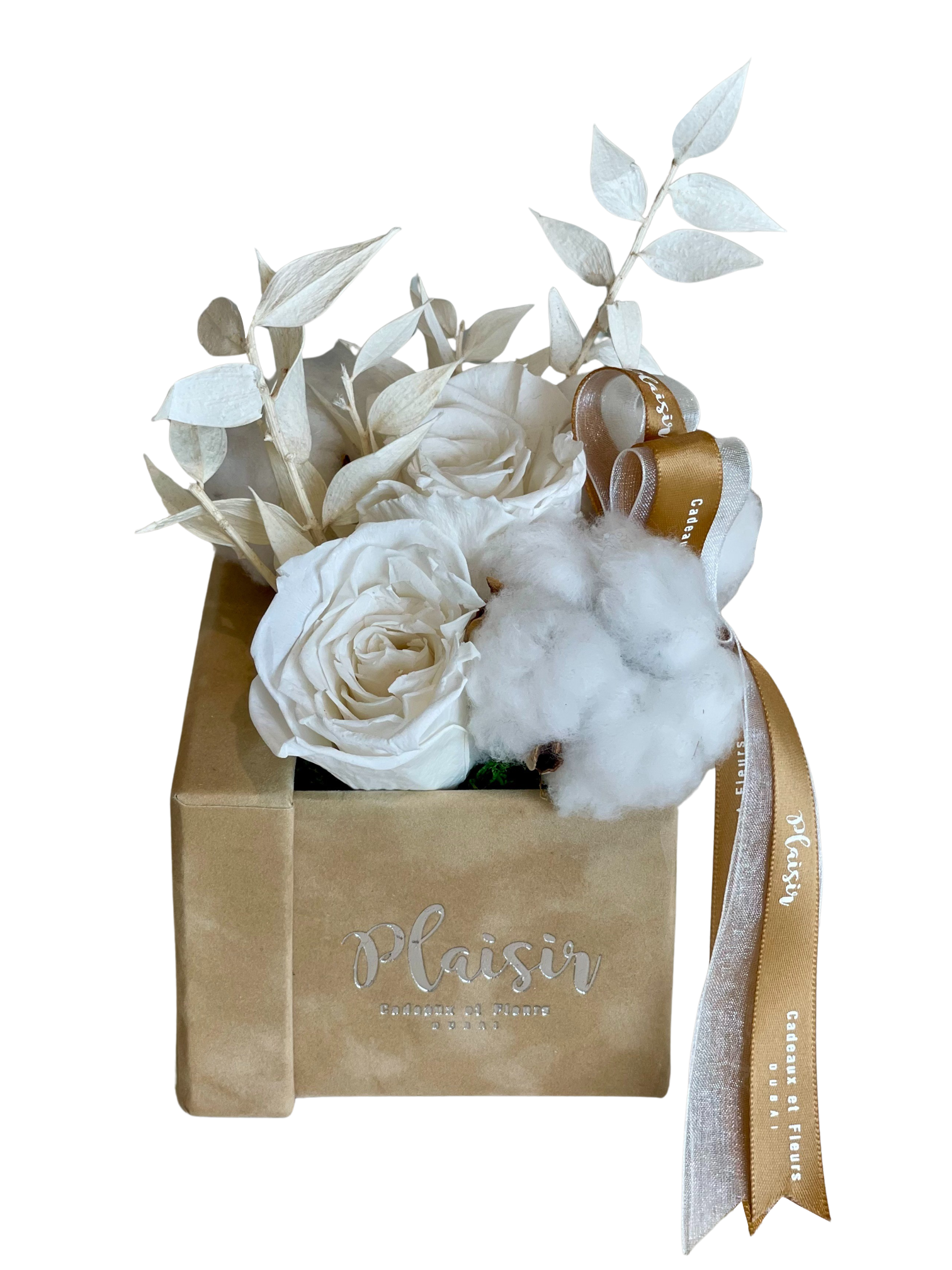 صندوق Petite Square Double Infinity من Plaisir (حجم الصندوق 8x8 سم) هو هدية مثالية تستمر في العطاء. تدوم هذه المجموعة الفريدة والجميلة من الزهور طويلة العمر في صندوق Plaisir المخملي الفاخر لأكثر من عام، وتحتوي على زهرتين طويلتي العمر إلى جانب زهور قطنية وأزهار جافة موسمية أخرى، مع شرائط مطابقة مكملة مثبتة بدبوس كريستالي رائع. لن تبهر هذه الهدية الرائعة متلقيها فحسب، بل إنها أيضًا شهادة على ذوقك الأنيق. سواء كان ذلك على مكتبهم أو في المنزل، فمن المؤكد أنهم سيتذكرونك كل يوم.