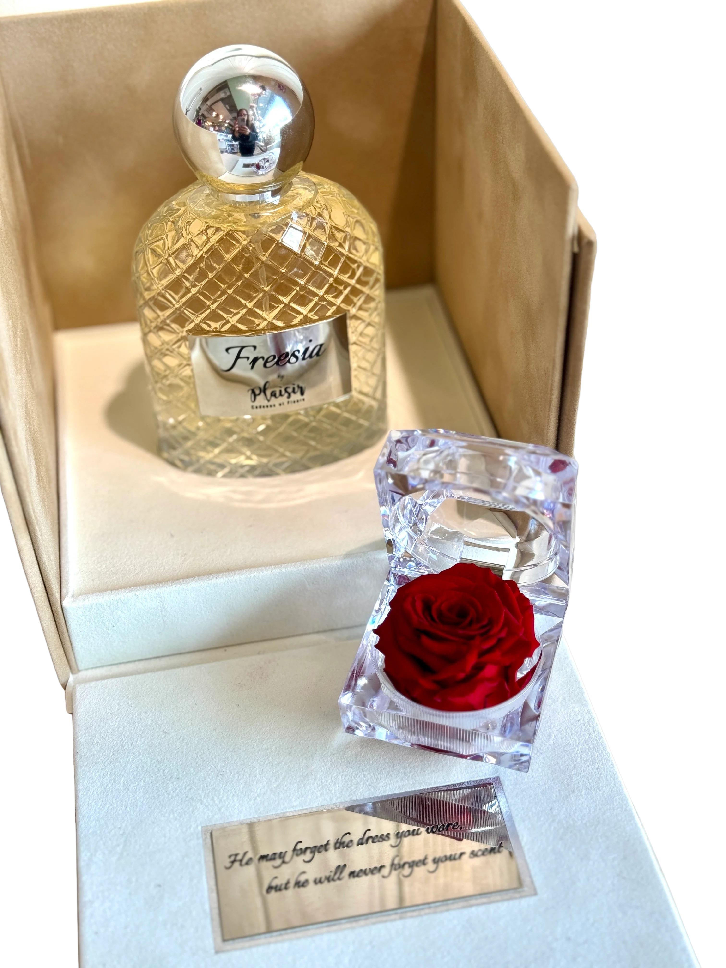 Immerse yourself in the captivating allure of Freesia, a luxurious fragrance crafted for the radiant, elegant woman. This enchanting perfume unfolds like a secret garden, with the delicate sweetness of freesia petals intertwined with the depth of jasmine, tuberose, and gardenia. A sparkling hint of orange blossom dances through, adding a whisper of citrus that uplifts the senses. Freesia is more than a scent—it is an invitation to revel in sophistication, grace, and timeless beauty. Encased in an exquisite bottle, presented in a uniquely luxurious velvet box, this exclusive fragrance is a celebration of femininity, designed to leave a lasting impression wherever you go.