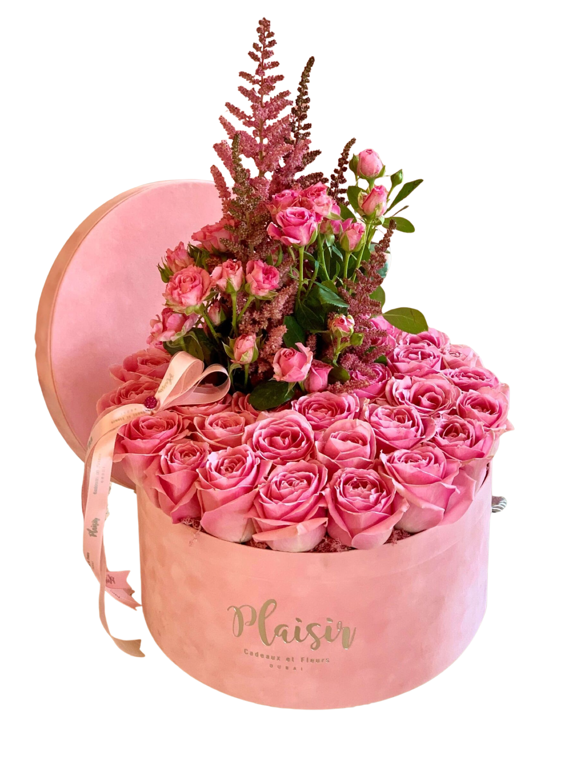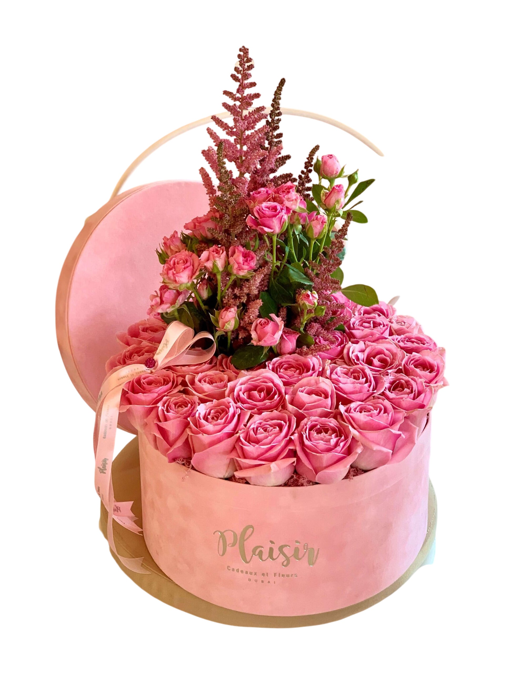 حديقة مليئة بالحب والأناقة لها... مزيج رائع من الورود وأستيلبي يجعل من هذا الصندوق الوردي المخملي الفاخر هدية مفضلة. رشي الزهور بالماء النظيف العذب كلما أمكنك يوميًا لإطالة عمرها.