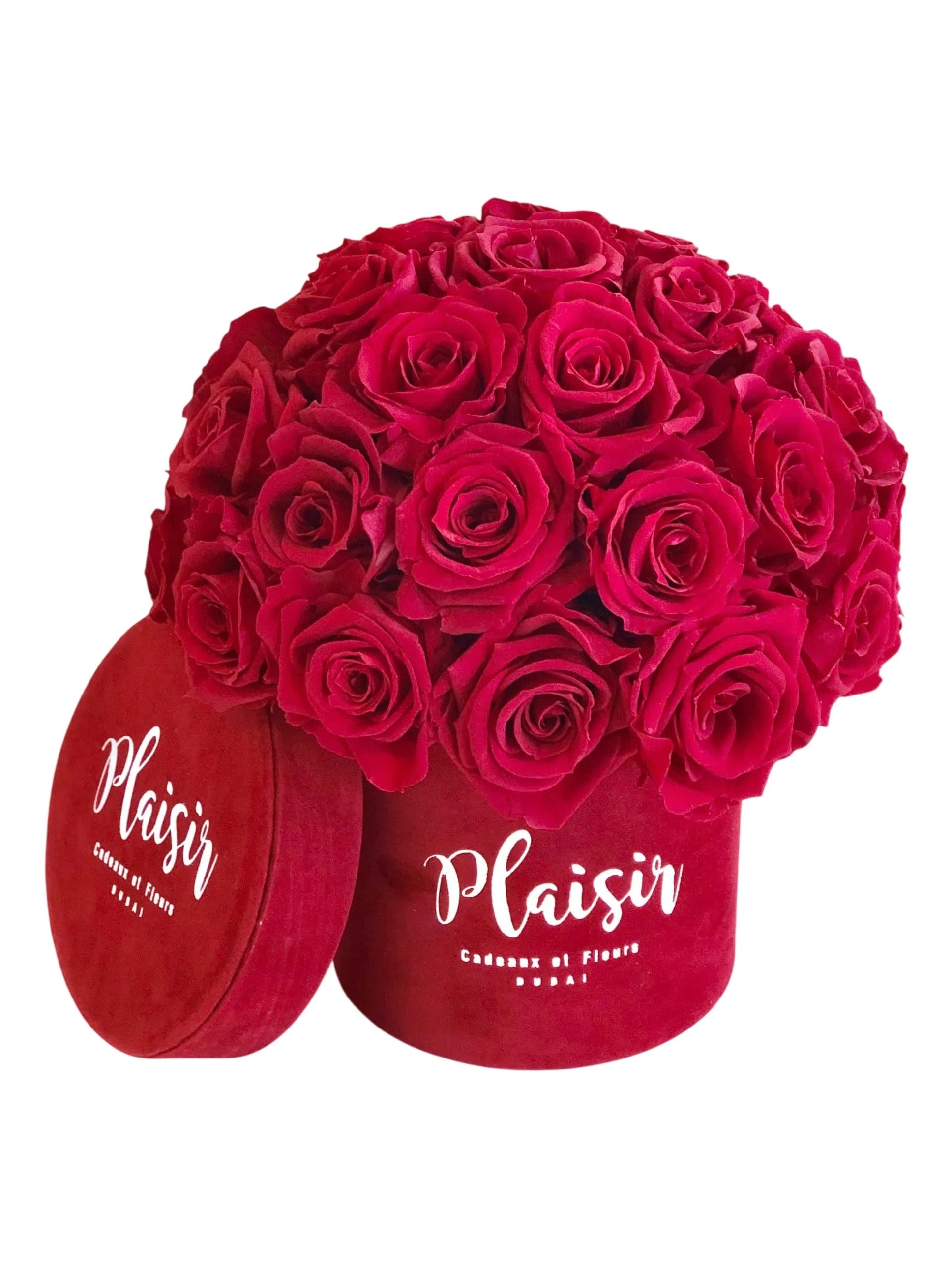 تم ترتيب هذا الصندوق المخملي الأحمر الصغير على شكل قبة أنيقة، ويحتوي على ما يصل إلى 30 وردة حمراء طويلة العمر (حجم الصندوق 12 × 12 سم).