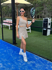 An absolute stunner on the court, this two-piece padel/tennis top and skort in taupe colour will definitely make you stand out!