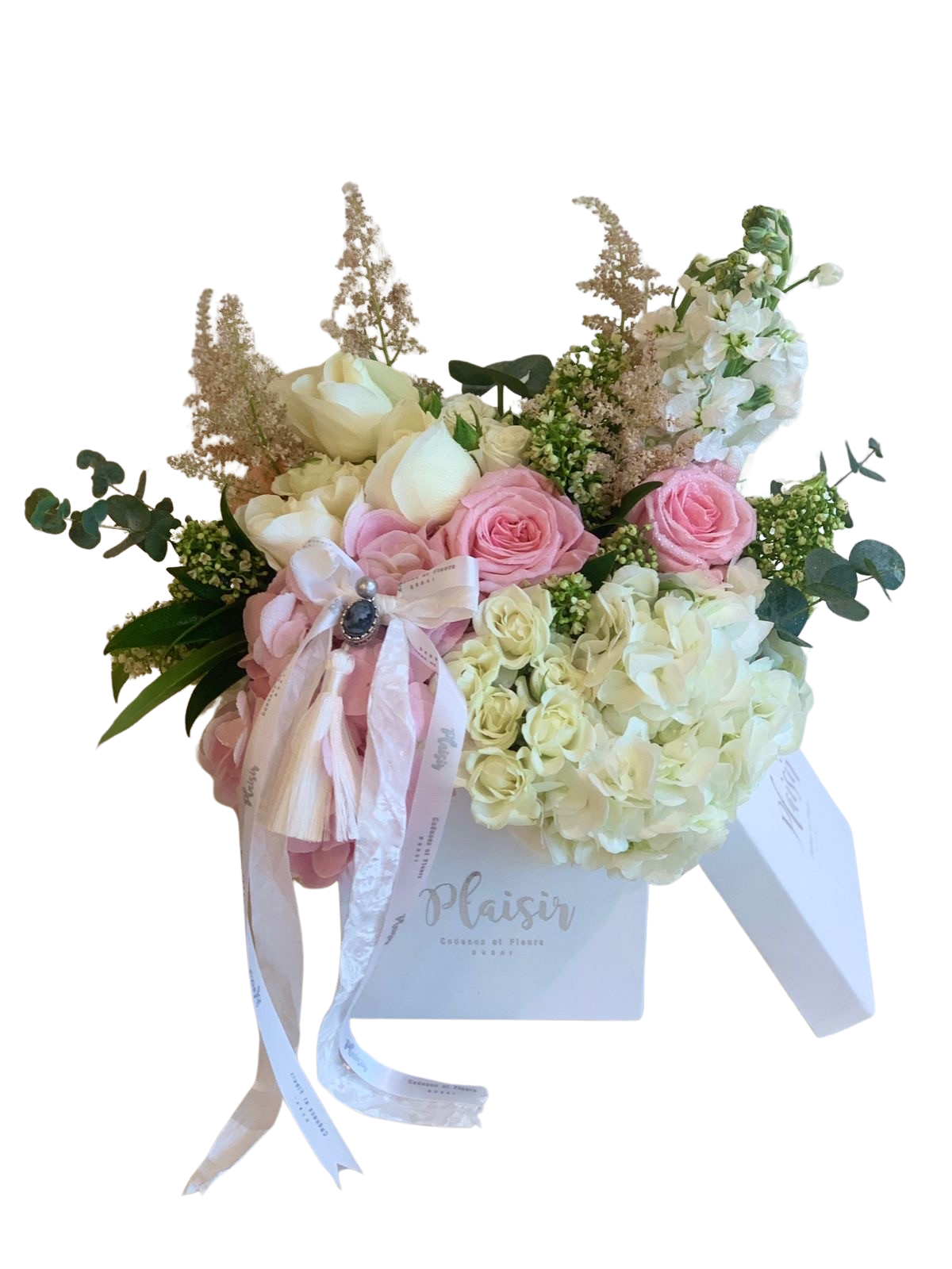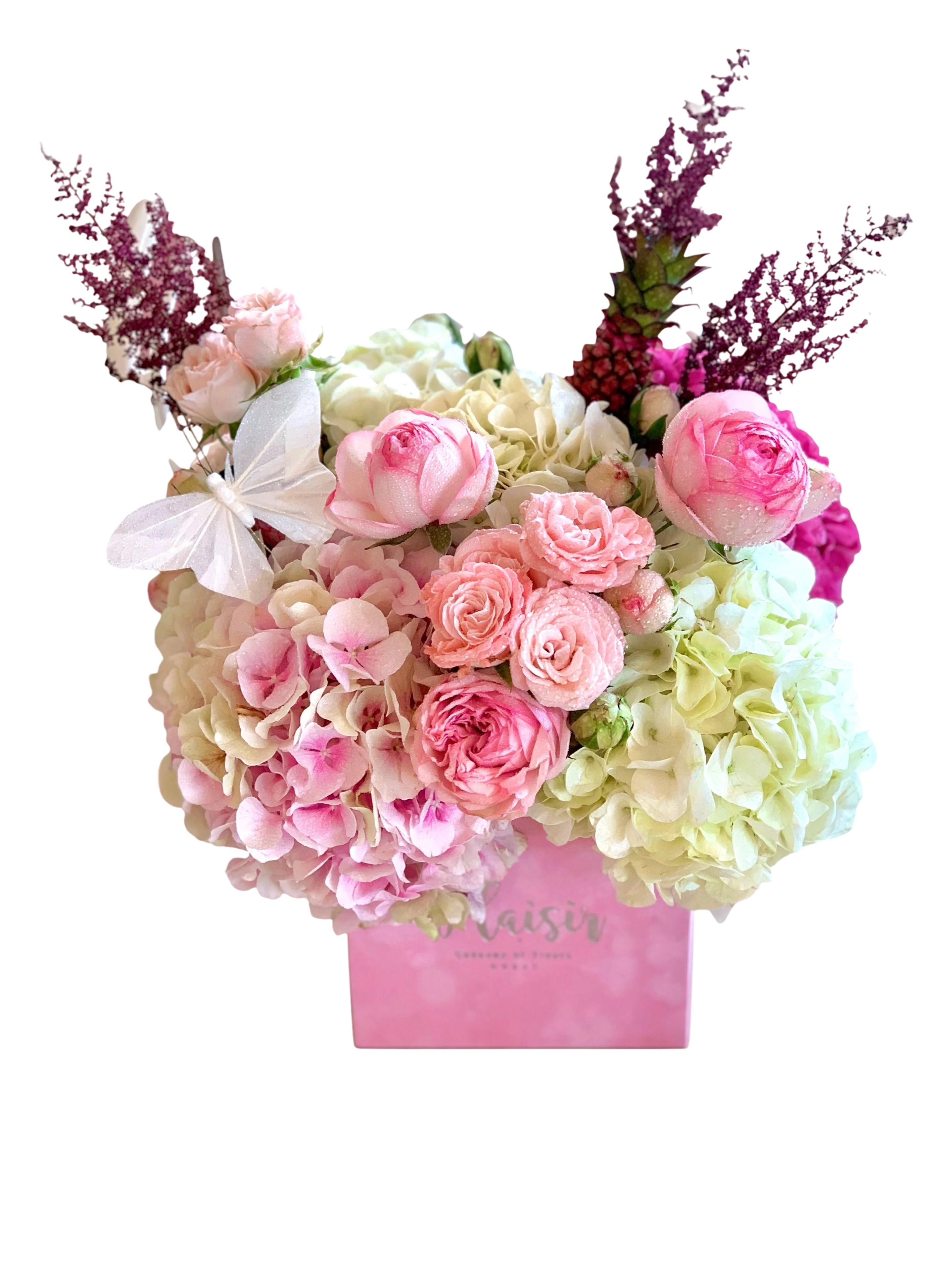صندوق Color Me Happy المليء بالزهور الجميلة والغريبة، الفريد والمتناغم، هو مزيج رائع من الأزهار البيضاء والوردية التي تزينها الفراشة. من المؤكد أنه سيرسم ابتسامة كبيرة على وجه من يستقبلك.