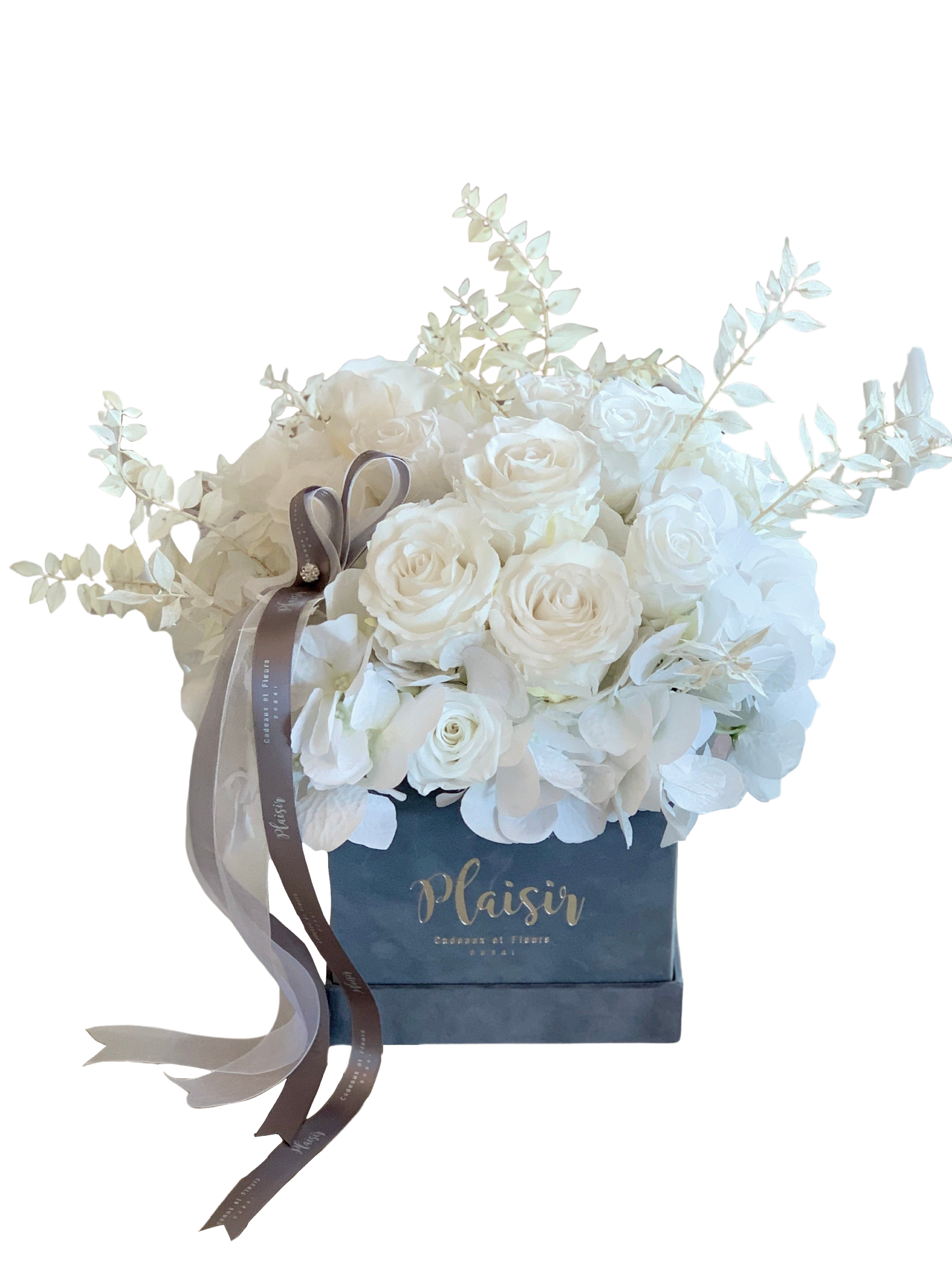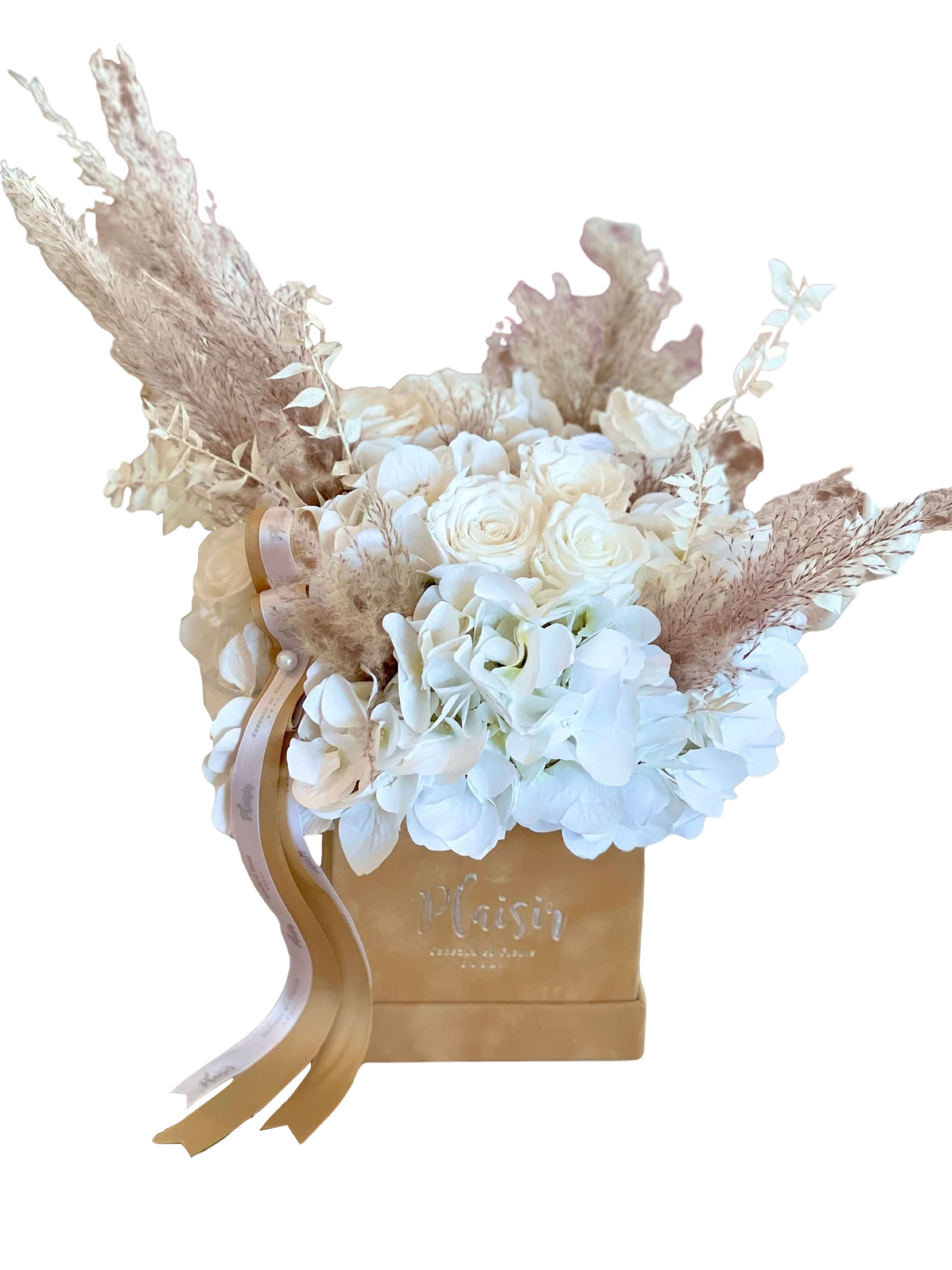 صندوق مخملي أبيض جميل، يحتوي على مزيج من الزهور اللانهائية والجافة والحريرية التي لا تموت وتحافظ على شكلها وجمالها. سيتمكن متلقي الهدية من الاستمتاع بهذا الجمال الرائع لفترة طويلة جدًا وسيتذكرك كل يوم من أيام السنة!