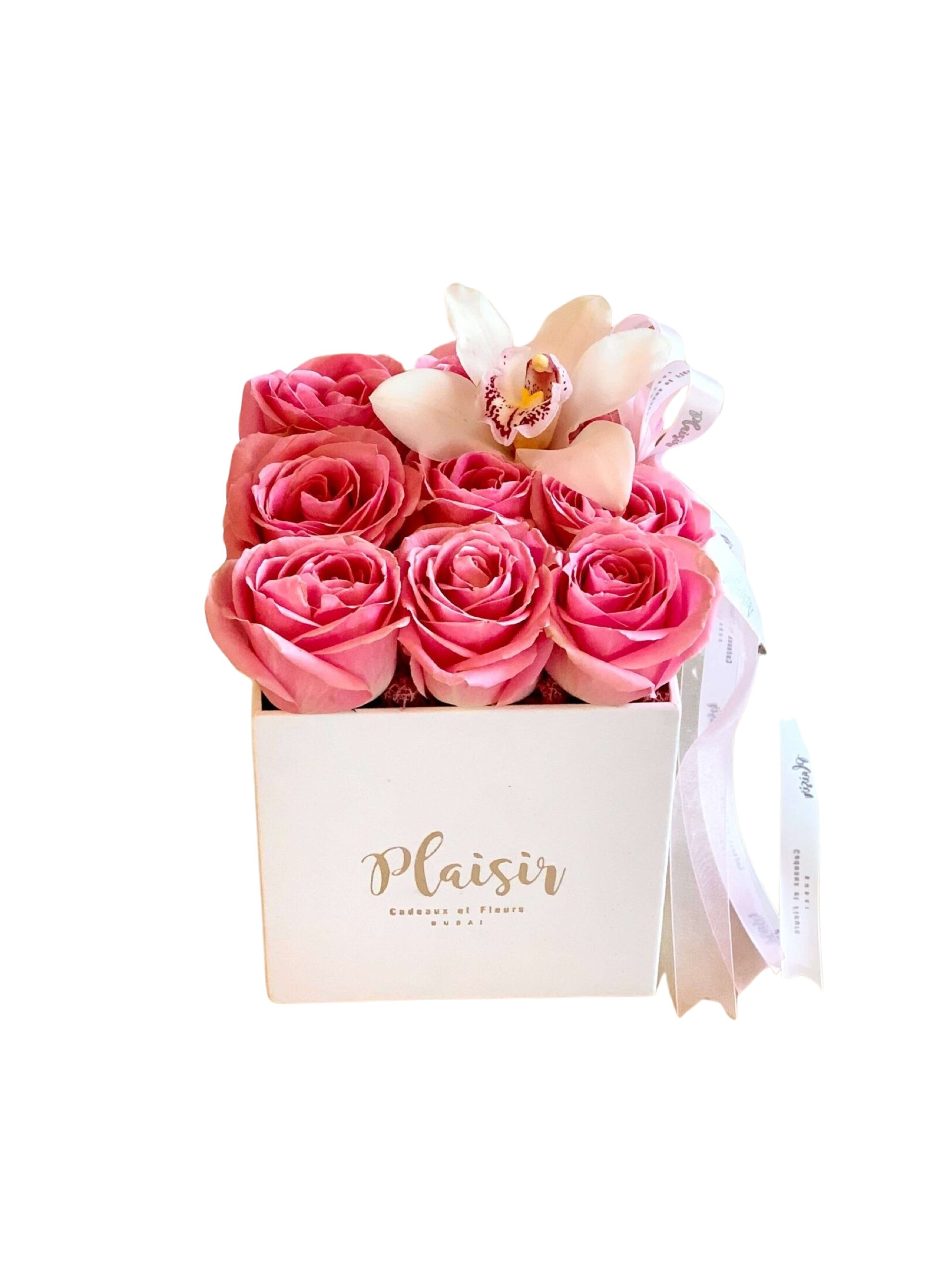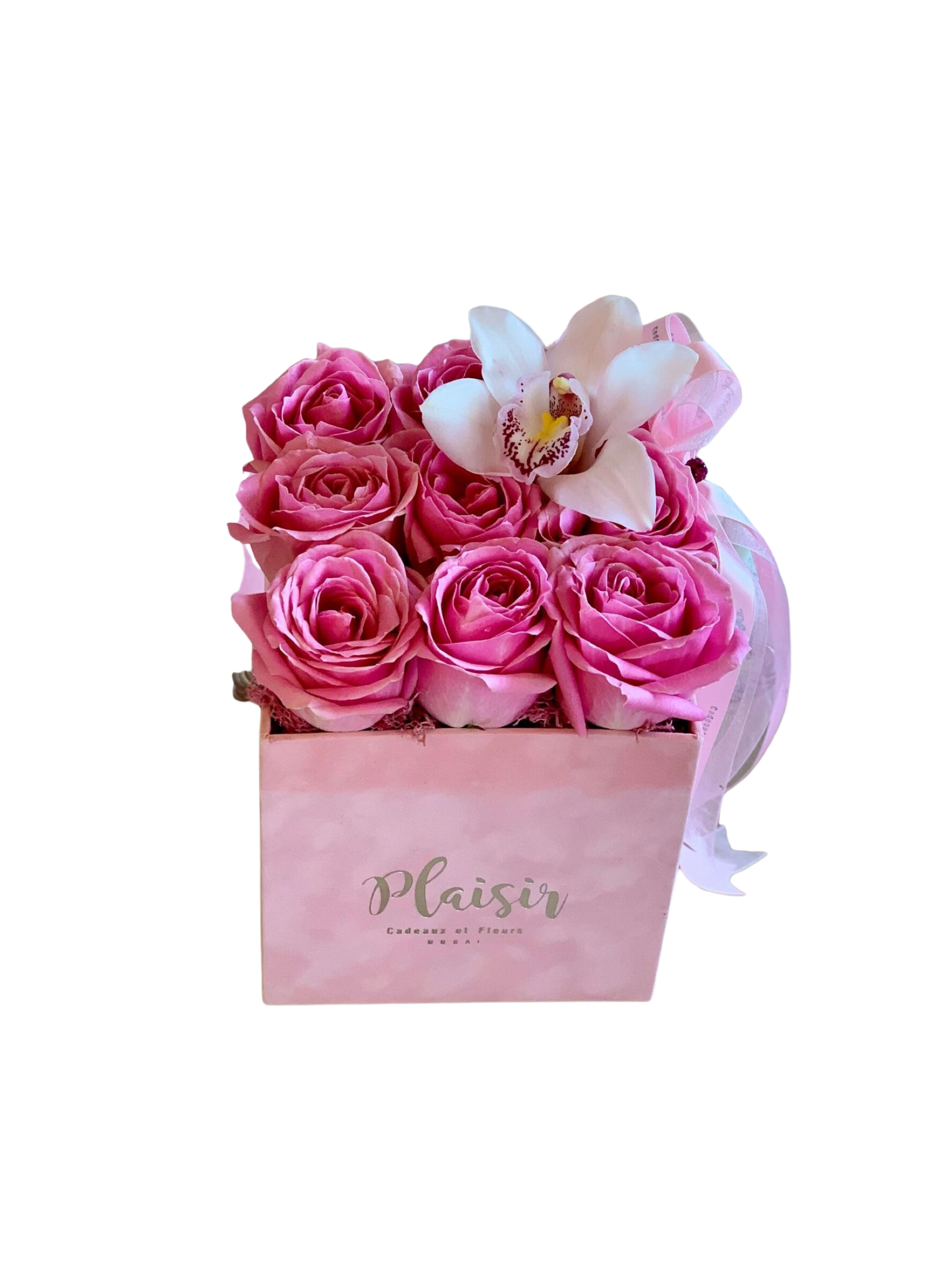 تسع ورود وردية كبيرة جدًا من الإكوادور في صندوق مخملي أرجواني فاخر من Plaisir Cadeaux et Fleurs، يعلوها زهرة أوركيد سيمبيديوم رائعة، مما يجعل صندوق الورود هذا فريدًا من نوعه مثل الشخص الذي يتلقاه. هذا الصندوق الجميل من الورود والأوركيد الناعم والدقيق والفخم ينقل لك أرقى أمنياتك.