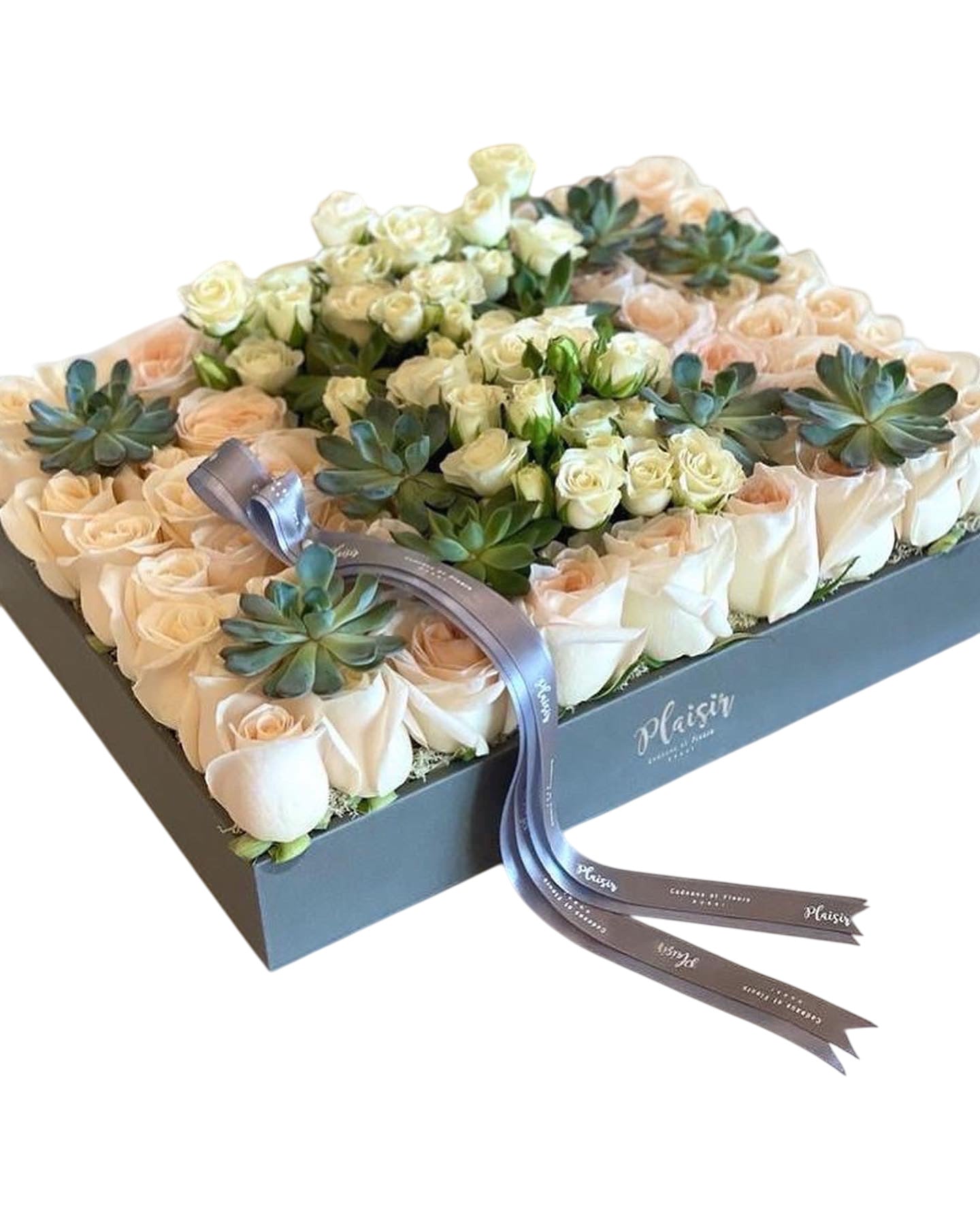 هذا الترتيب المذهل هو قمة الرقي في عالم الزهور. فهو يتميز بمزيج من الورود الطازجة بأحجام مختلفة، مع لمسات من النباتات العصارية الصغيرة. هذا الترتيب المذهل مزين بشرائط الحرير والأورجانزا من Plaisir وموضوع في صينية جلدية رمادية براقة. هذا الترتيب الرائع من المؤكد أنه سيبهر الجميع.