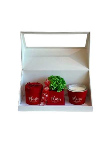 تزيل علبة الهدايا الكلاسيكية الثلاثية من Plaisir Cadeaux et Fleurs التخمين من عملية العثور على الهدية المثالية والمدروسة جيدًا. تتضمن هذه الطبعة المحدودة الحصرية الاحتفالية شمعة فاخرة وشوكولاتة لذيذة وزهرة هدرانجيا لا متناهية ستدوم لأكثر من عامين. كل عنصر جميل من الناحية الجمالية، تم تصميمه من مخمل متناسق ومقدم بأناقة في علبة هدايا فاخرة. يا لها من طريقة أنيقة لإرسال أطيب تمنياتك لهذا الموسم!