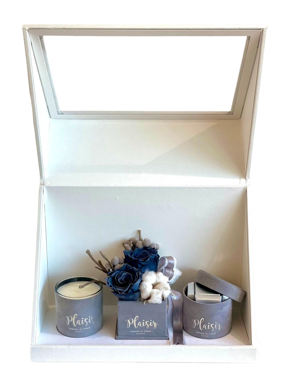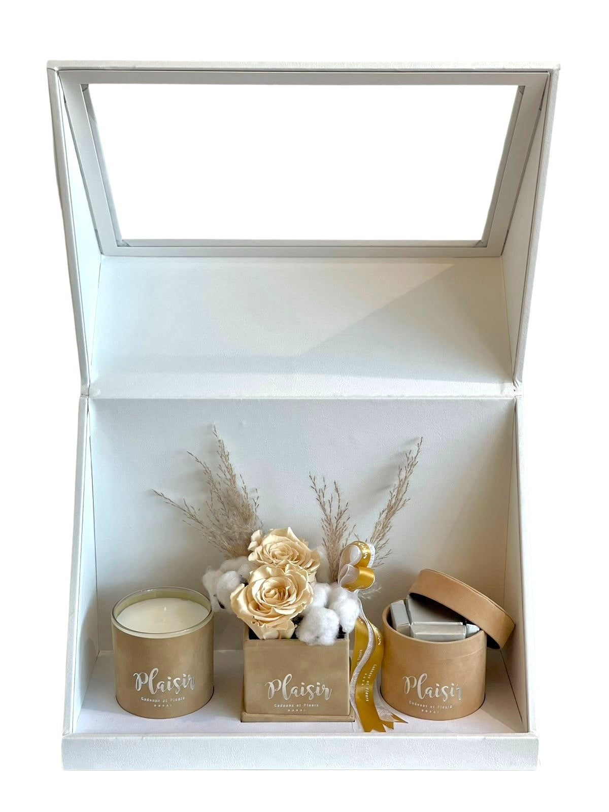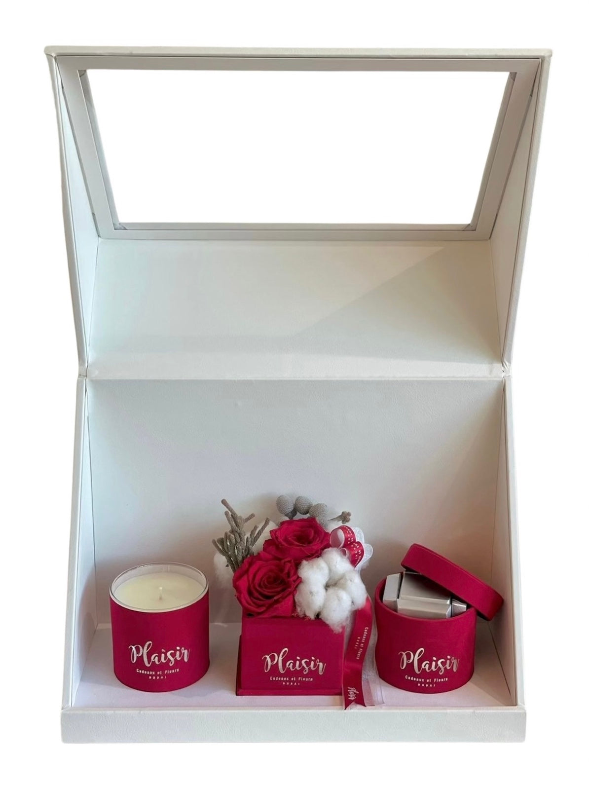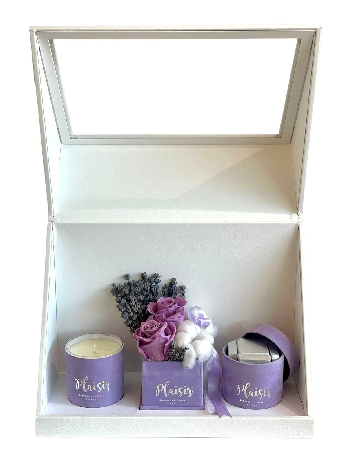 إن صندوق الهدايا الثلاثي الأبيض من Plaisir Cadeaux et Fleurs يزيل التخمين من عملية العثور على الهدية المثالية والمدروسة جيدًا. فهو يتضمن شمعة فاخرة وشوكولاتة لذيذة وترتيبًا مزدوجًا من الورود اللانهائية التي ستدوم لأكثر من عام. كل عنصر جميل من الناحية الجمالية، حيث تم تصميمه بألوان مخملية متطابقة ومقدم بأناقة في صندوق هدايا فاخر.