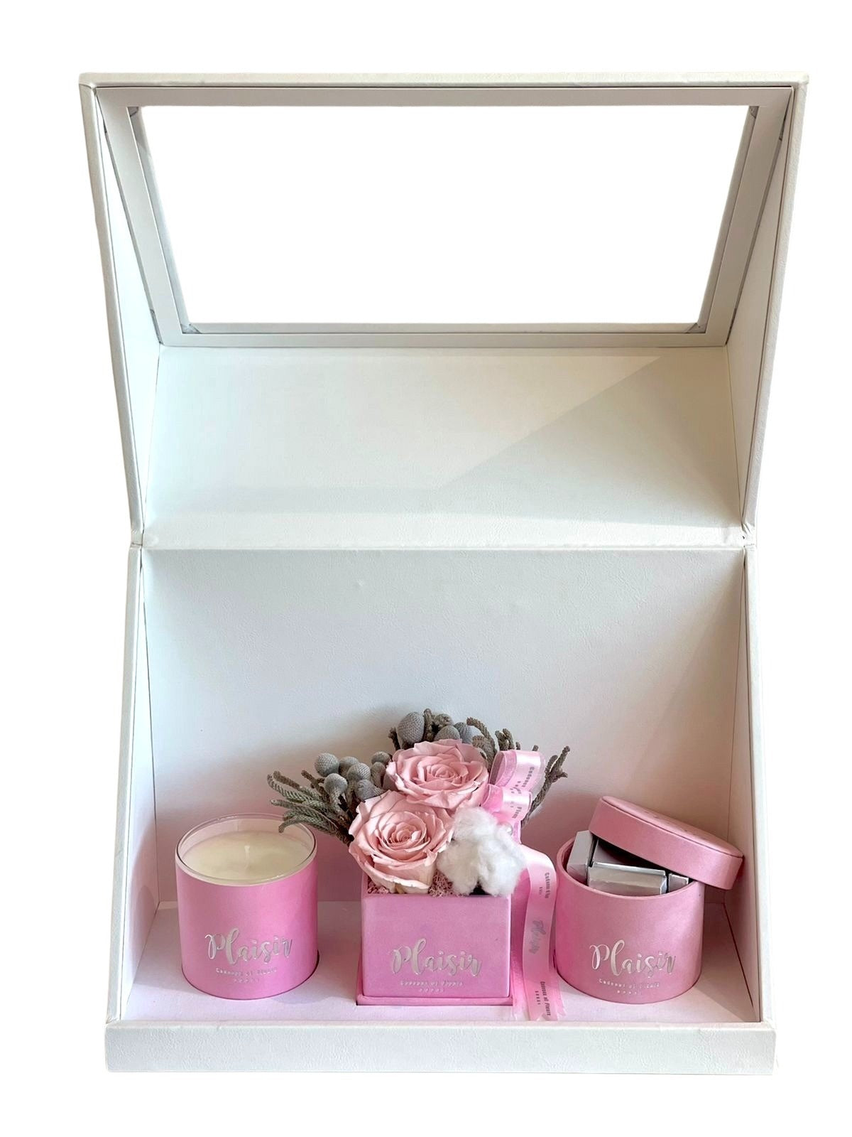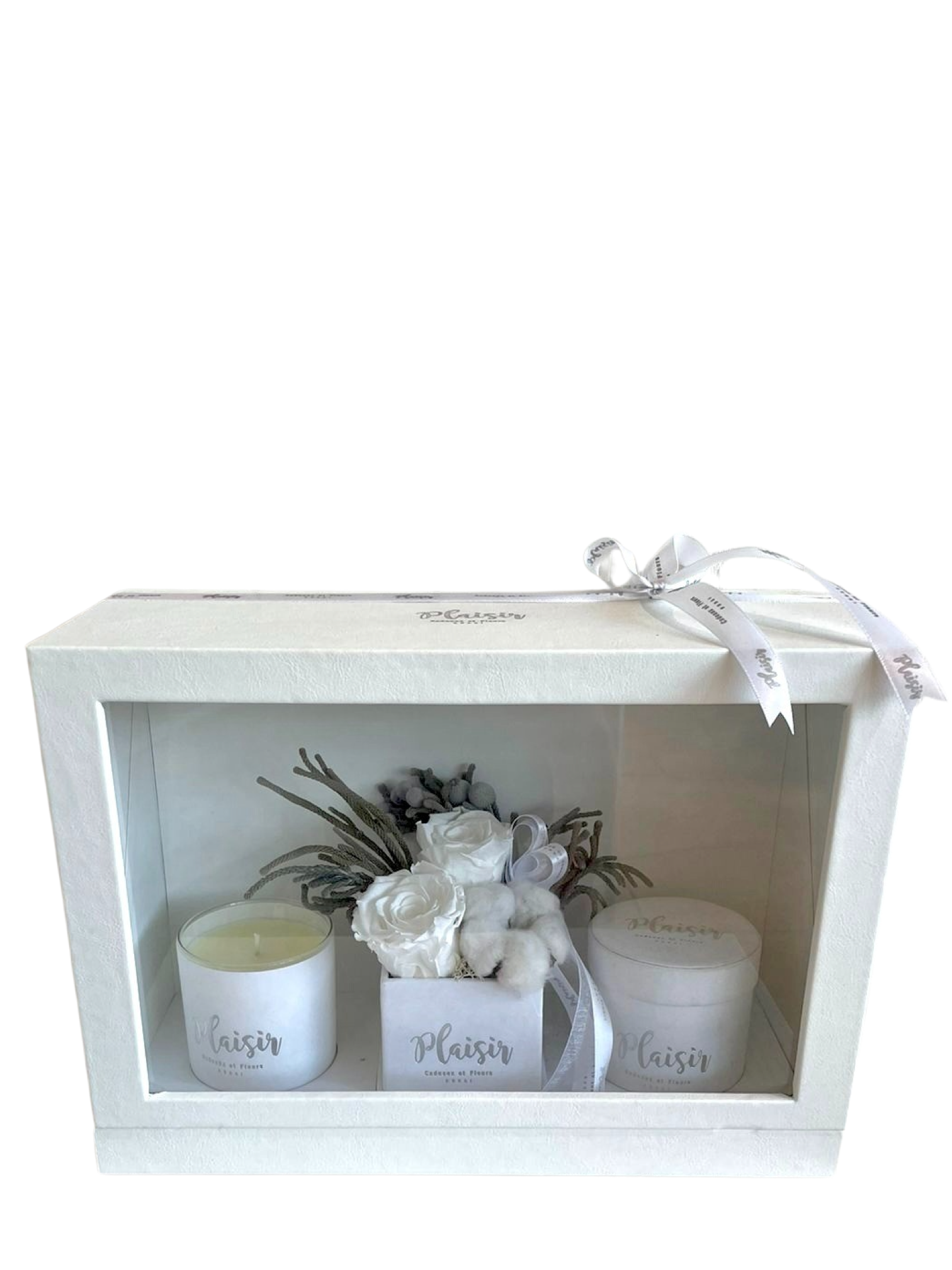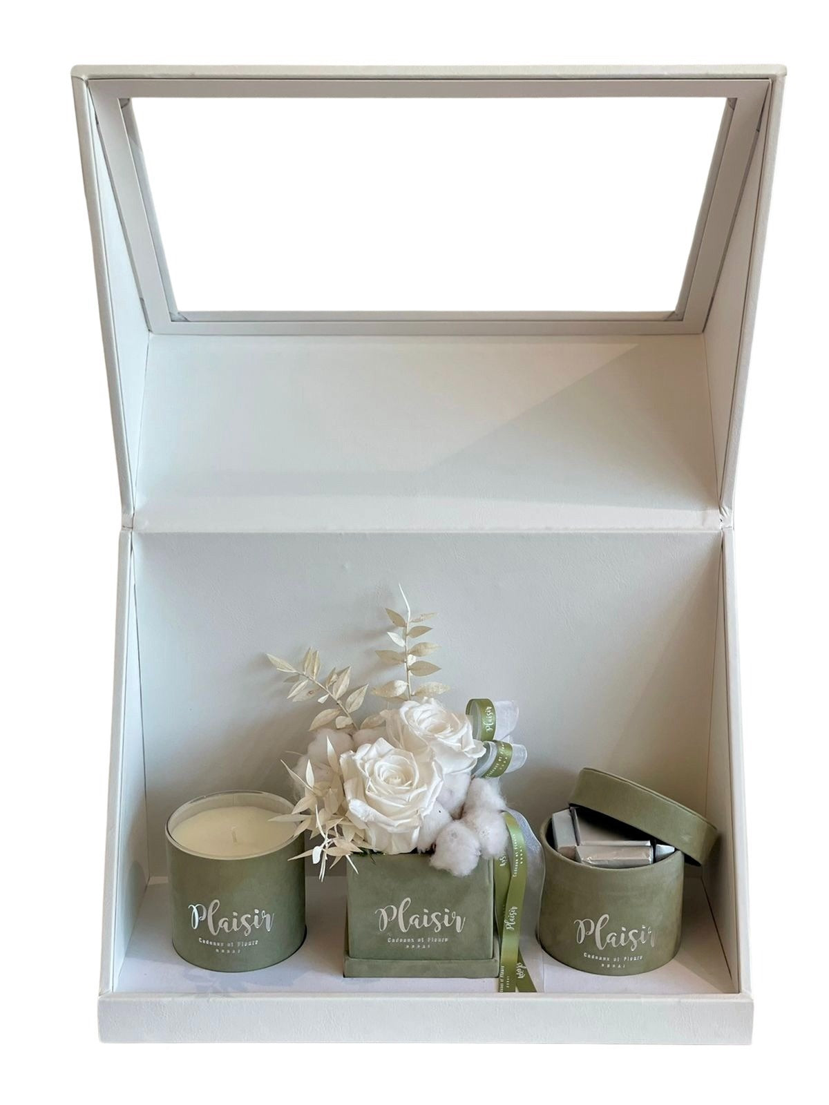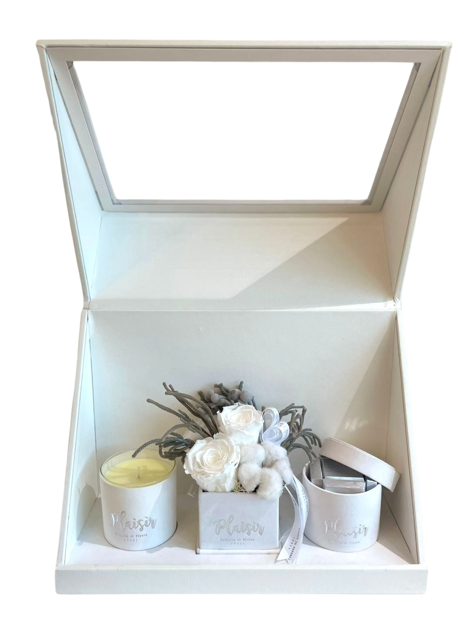 إن صندوق الهدايا الثلاثي الأبيض من Plaisir Cadeaux et Fleurs يزيل التخمين من عملية العثور على الهدية المثالية والمدروسة جيدًا. فهو يتضمن شمعة فاخرة وشوكولاتة لذيذة وترتيبًا مزدوجًا من الورود اللانهائية التي ستدوم لأكثر من عام. كل عنصر جميل من الناحية الجمالية، حيث تم تصميمه بألوان مخملية متطابقة ومقدم بأناقة في صندوق هدايا فاخر.