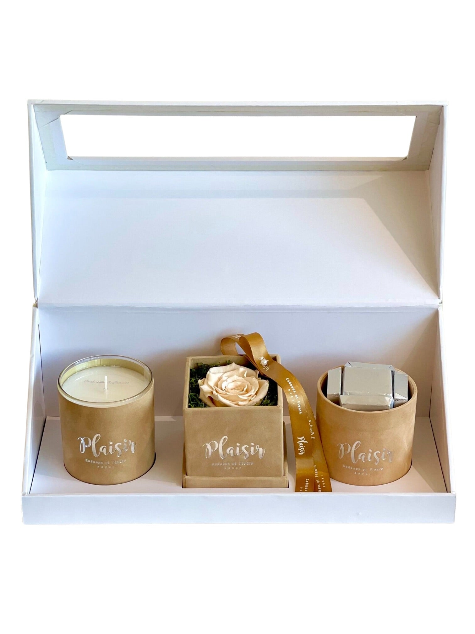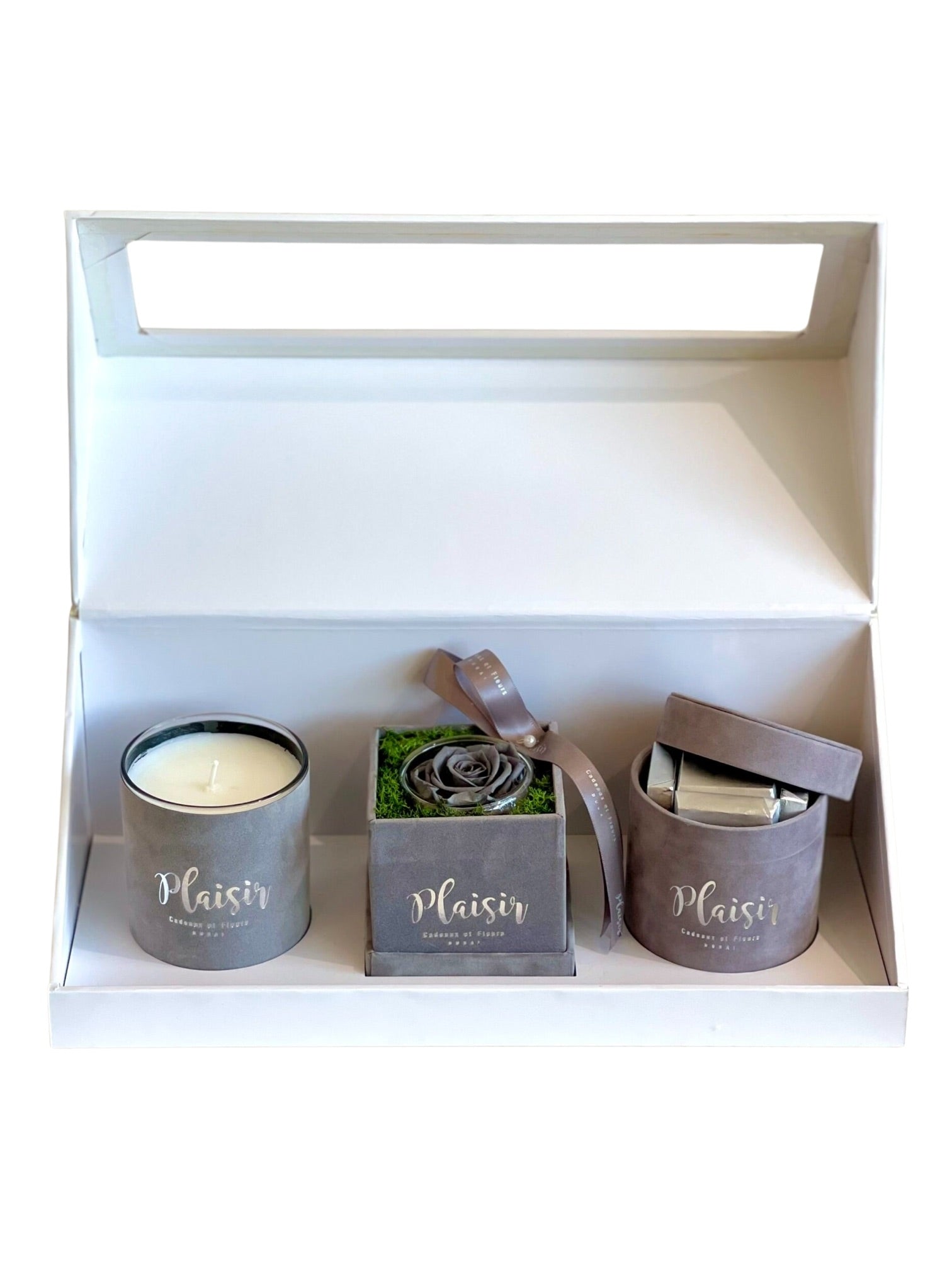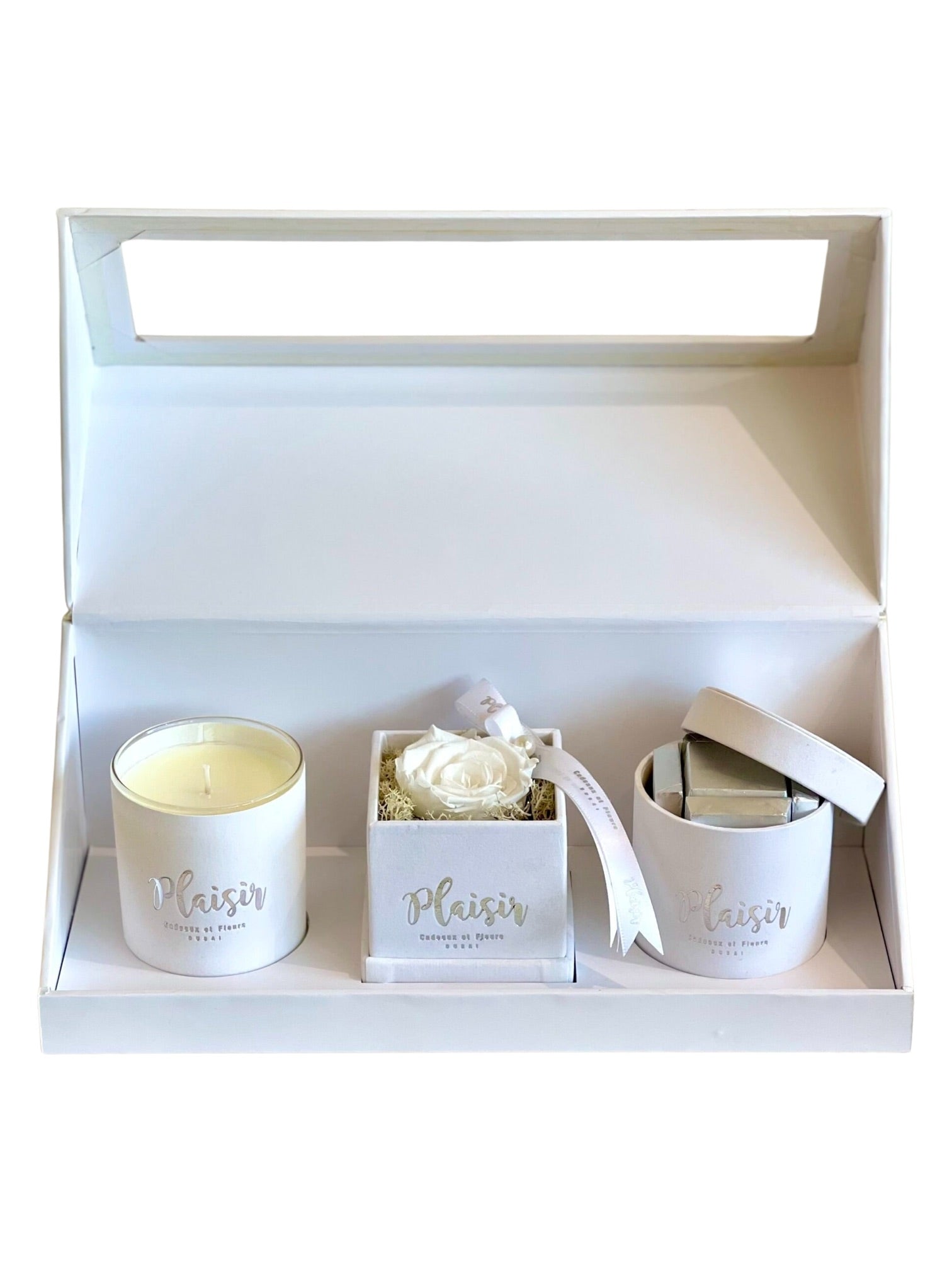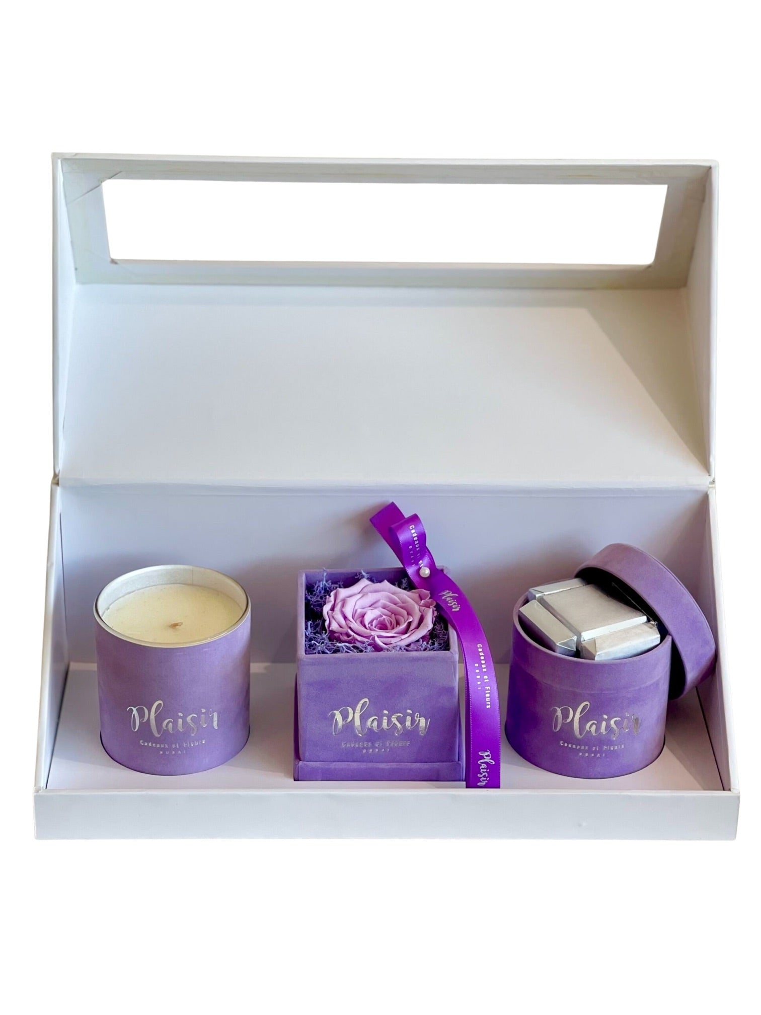 تزيل علبة الهدايا الكلاسيكية الثلاثية البيضاء من Plaisir Cadeaux et Fleurs التخمين من عملية العثور على الهدية المثالية والمدروسة جيدًا. فهي تتضمن شمعة فاخرة وشوكولاتة لذيذة ووردة لا متناهية ستدوم لأكثر من عام. تتميز كل قطعة بتصميم جميل بألوان مخملية متناسقة ومقدمة بأناقة في علبة هدايا فاخرة.