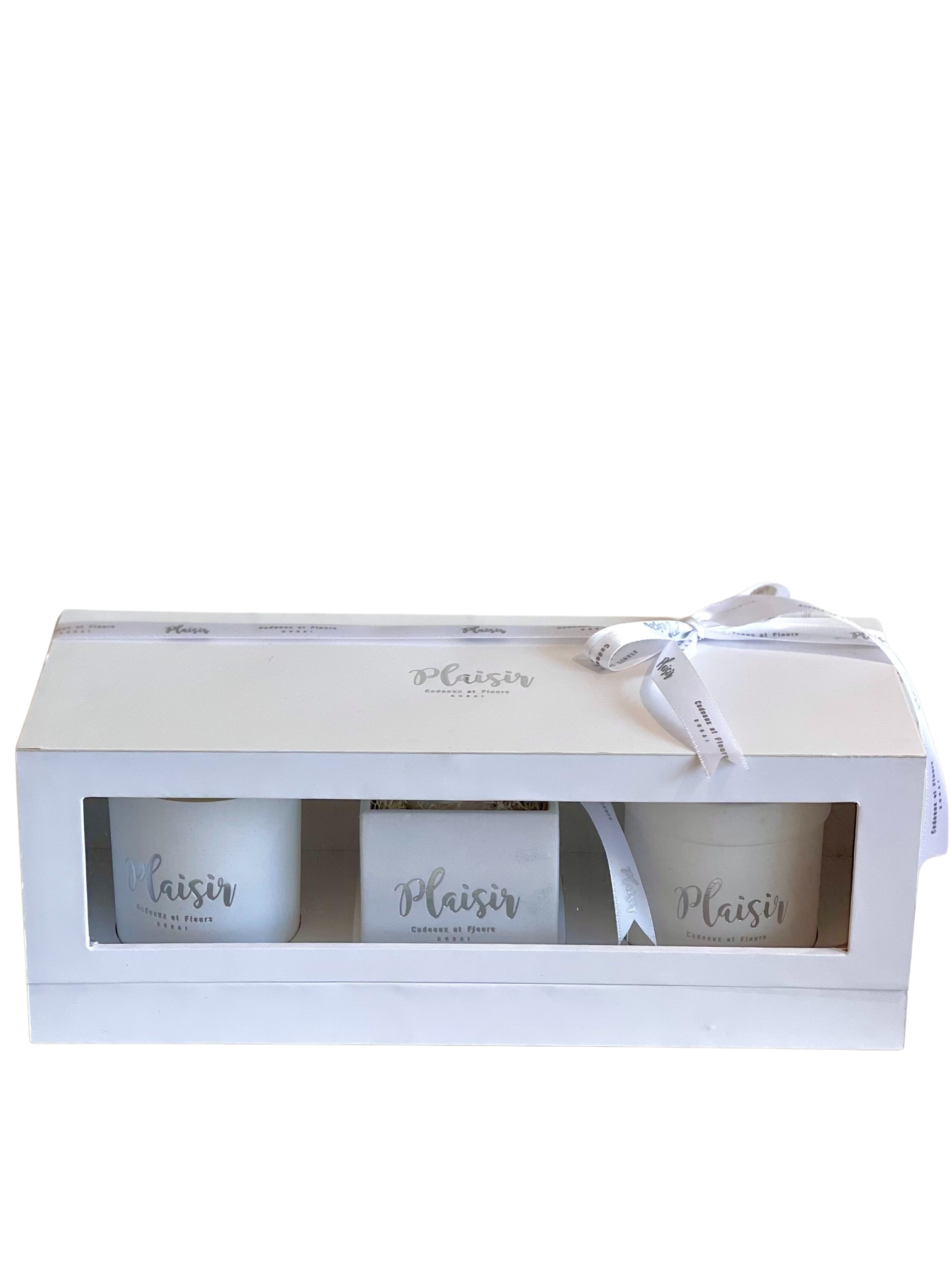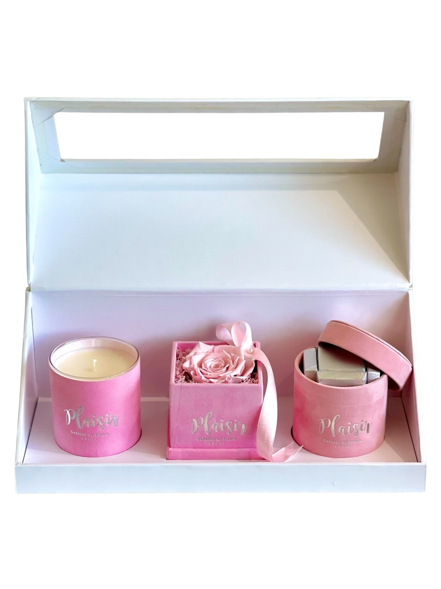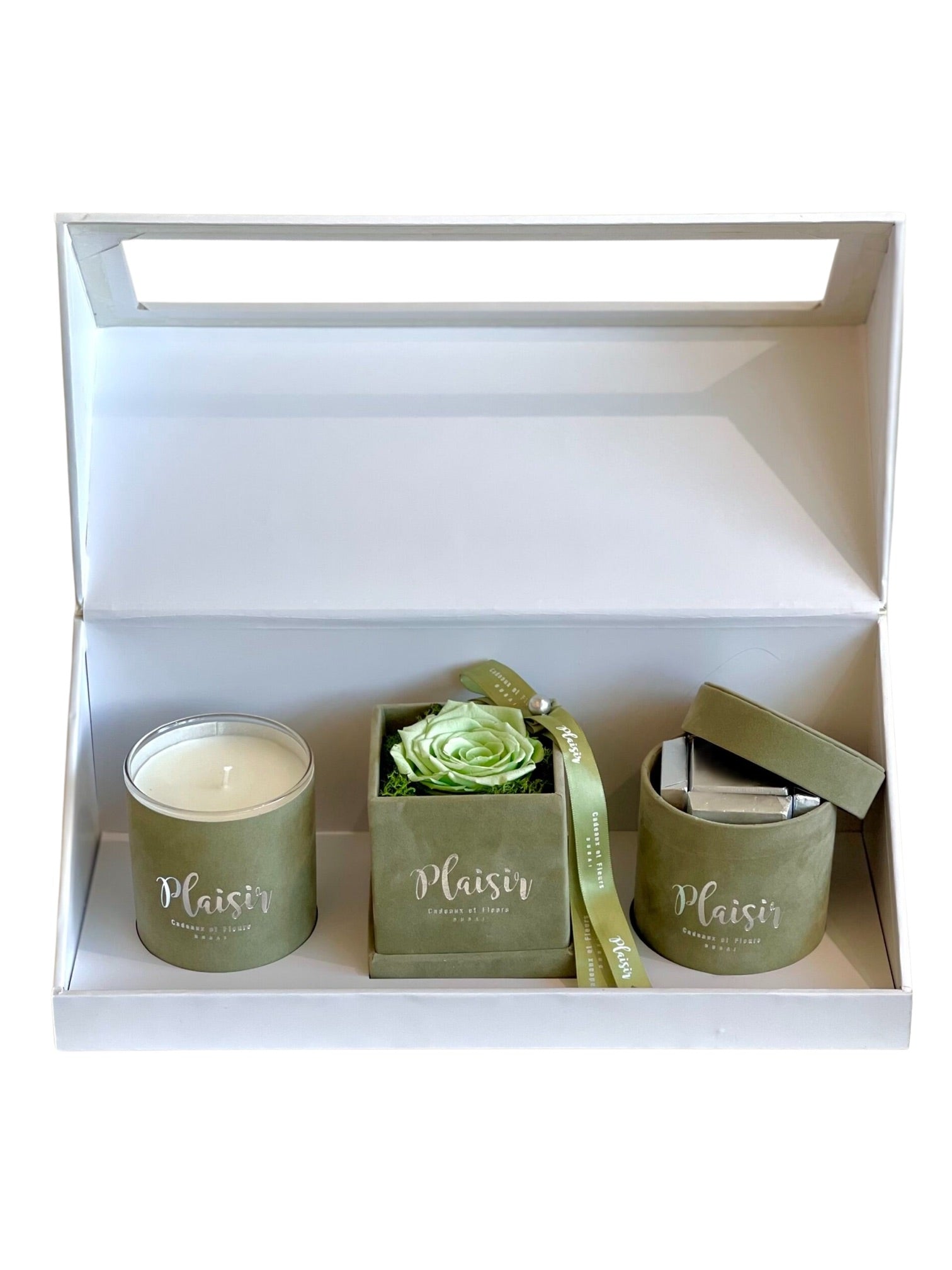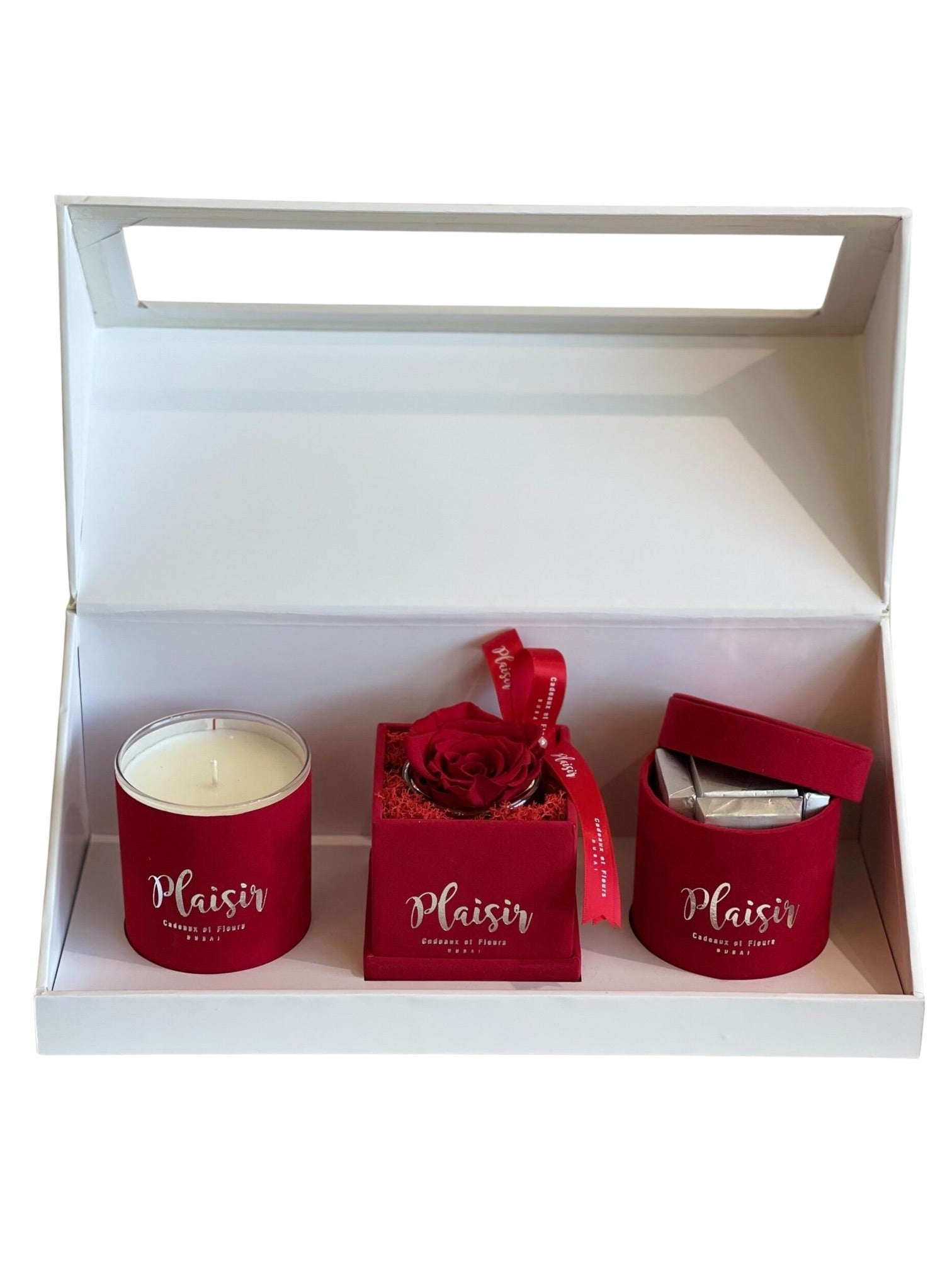تزيل علبة الهدايا الكلاسيكية الثلاثية البيضاء من Plaisir Cadeaux et Fleurs التخمين من عملية العثور على الهدية المثالية والمدروسة جيدًا. فهي تتضمن شمعة فاخرة وشوكولاتة لذيذة ووردة لا متناهية ستدوم لأكثر من عام. تتميز كل قطعة بتصميم جميل بألوان مخملية متناسقة ومقدمة بأناقة في علبة هدايا فاخرة.