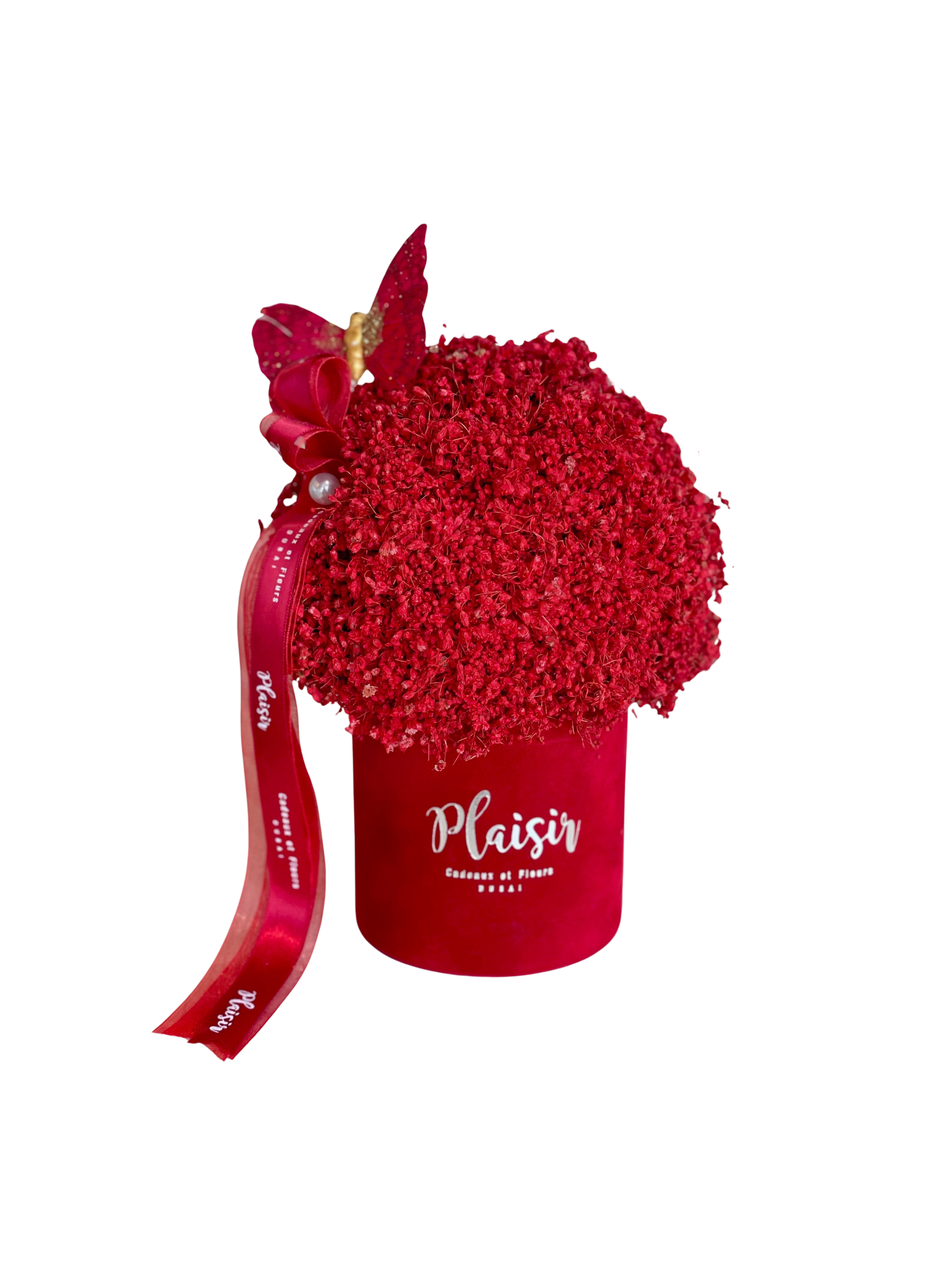 This gorgeous luxury velvet box filled with red gypsophila is sure to make anyone’s day special! This fiery arrangement is designed to last, featuring dried, hand-painted gypsophila that is elegantly presented in Plaisir’s signature velvet box. Perfect for any home or office decor...Make someone special smile today with this unique arrangement.