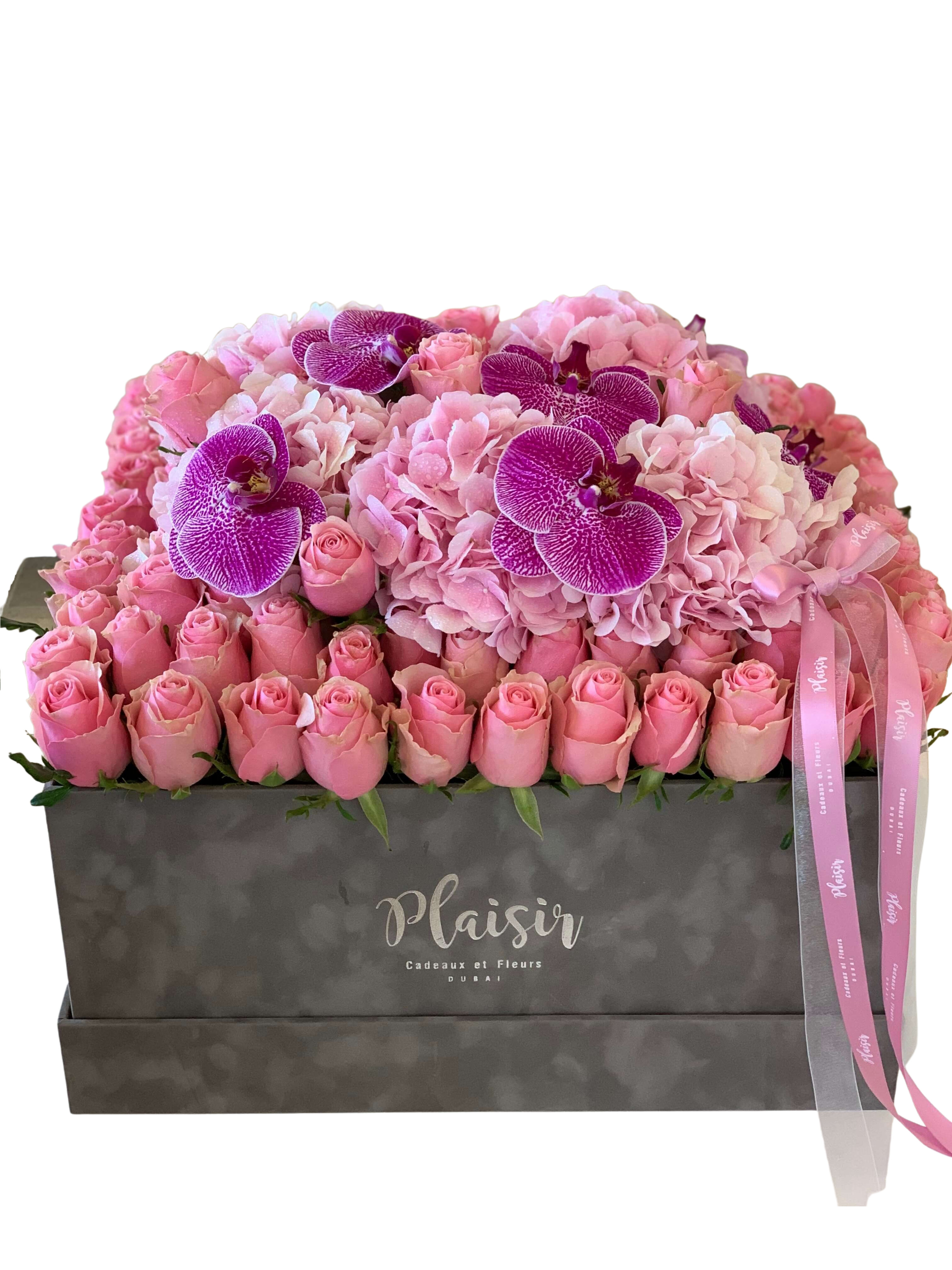 سوف يبهر صندوق VIP باللون الوردي بالكامل المرأة التي يصعب إبهارها. يحتوي صندوق VIP المخملي الفاخر من Plaisir Cadeaux et Fleurs على أكثر من 100 زهرة مزينة بمجموعة متنوعة من ظلال اللون الوردي وأزهار الأوركيد، ومزينة بشرائط الحرير والشيفون المميزة من Plaisir، مما ينقل لك أرقى أمنياتك. إنه صندوق مذهل بكل المقاييس!