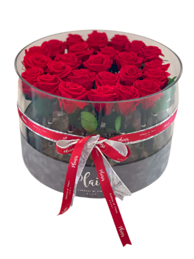 25 Rose Box. The Acrylic box is the ultimate in floral couture. Handmade with heat, the acrylic box is fully reusable. Plaisir’s luxurious round acrylic box is home to 25 beautiful fresh roses. Acrylic boxes are designed to be used again and again just like a vase. Perfect for home decor or office, it's a beautiful touch to any space.