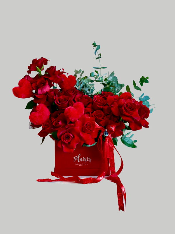 Red is for love….not just for Valentine's Day but all year around. Love is for lover’s love, mother’s love, friendship love, sibling love, parental love….Love is not limited. Give love, receive love, any day of the year! This incredibly stunning red rose and plush hearts arrangement with luxurious eucalyptus in Plaisir Cadeaux et Fleurs' gorgeous red velvet box is guaranteed to wow your receiver!