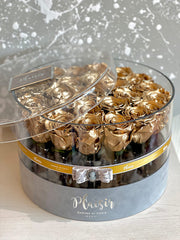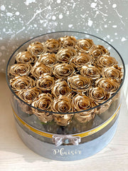 The Acrylic box is the ultimate in floral couture. Handmade with heat, the acrylic box is fully reusable. Plaisir’s luxurious round acrylic box is home to 25 beautiful Gold Infinity roses which last more than two years without water or care! Perfect for home decor or office, it's a beautiful touch to any space while reminding your receiver of your elegant taste and your thoughtful ways day after day.