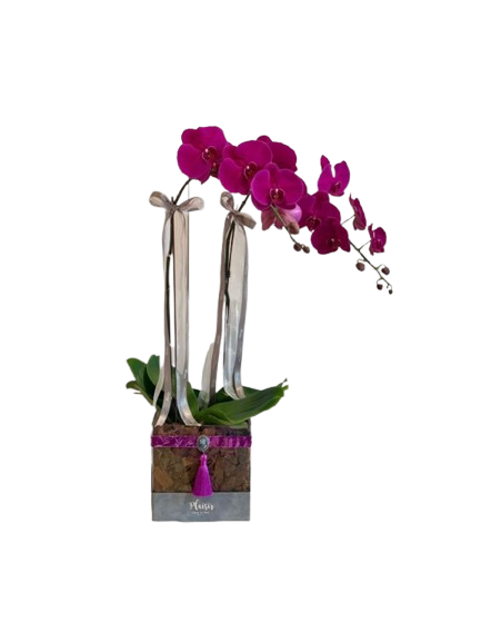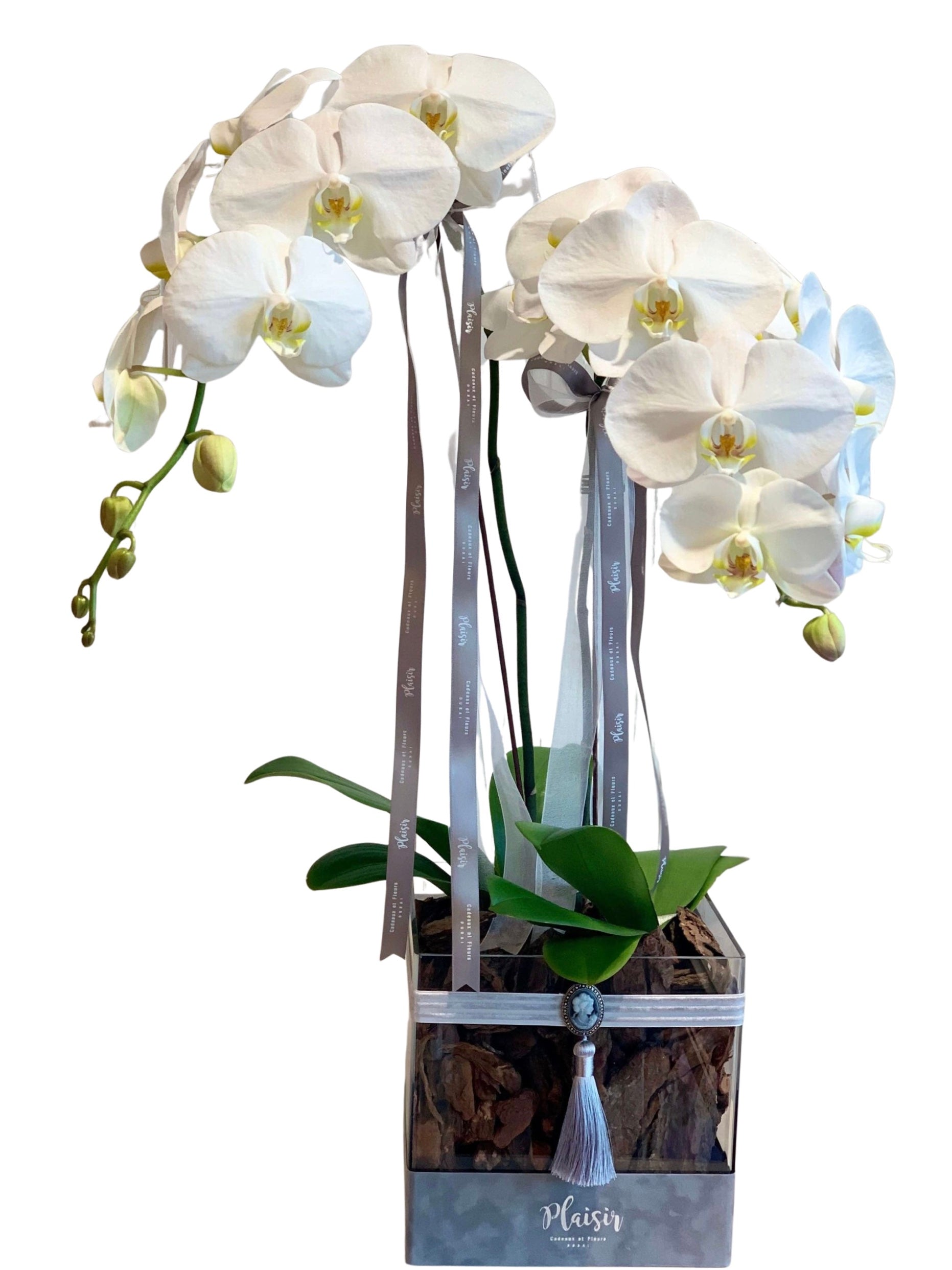 Luxury at its finest - two regal orchids elegantly set in Plaisir's opulent Square Acrylic Box, decorated with matching velvet ribbons and cameo. Nothing will impress your receiver more than long lasting orchids in Plaisir's Acrylic Box. Surprise someone today and quietly display your elegant taste.