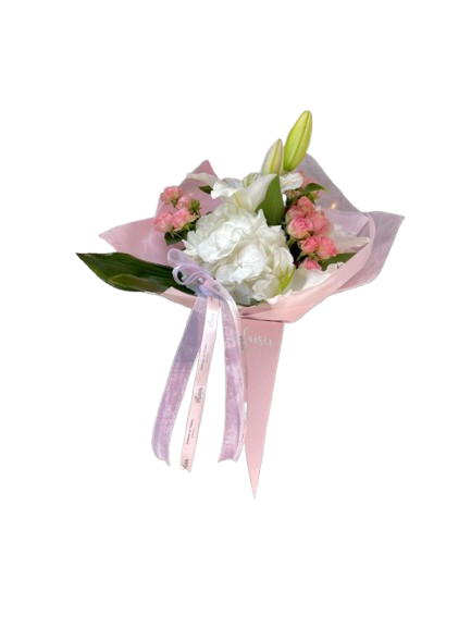 White Hydrangeas and Pink Roses. This lovely pink and white cone, is a perfect way to say Thank you, Congratulations, Happy Birthday, Welcome Back, Get Well Soon…or any other kind message you wish to express. Budget friendly yet unique, elegantly presented, uniquely Plaisir!