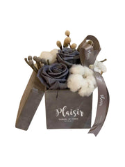 Plaisir Cadeaux et Fleurs' Petite Square Double Infinity box is a perfect gift that keeps on giving. Lasting for more than ONE year without any water or care, this unique and beautifully designed longlife flower combination in Plaisir's luxury velvet box contains two longlife roses alongside cotton flowers and complementary ribbons. Not only this exquisite gift guarantees to wow your receiver, it is also a testament of your elegant taste. Be it on their office desk or at home, you are sure to be remembered every day.