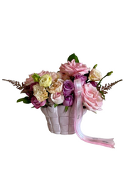 The most adorable flower arrangement set in a unique ceramic handbag. Surprise her with this cute and thoughtful gift!