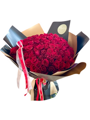 High quality, gorgeous red roses expertly hand tied in a traditional French style and shape, wrapped and decorated elegantly with Plaisir silk ribbons.