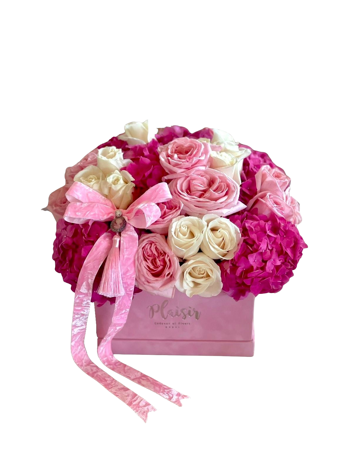 We believe in Pink! Always seeing the sunny side of life. Pink just makes everyone happier, so our large Pink Square box (20x20 cm) with a mix of Pink and White exquisite florals, velvet ribbon and Cameo makes this arrangement truly an unforgettable floral couture. We guarantee she will smile all day thinking of how thoughtful you are!