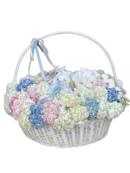 Hydrangeas Hydrangeas Hydrangeas and orchids!! 1 meter in diameters (!) this opulent and stunning arrangement consists of 111 Hydrangeas and several luxurious orchid stems. This incredible basket of blooms will leave your receiver utterly speechless!