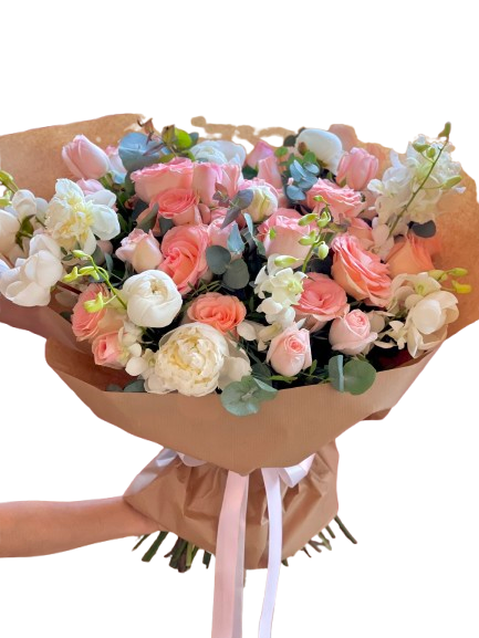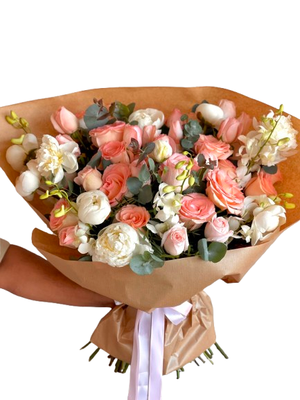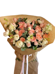 Pink and White Roses mixed with Orchids and Eucalyptus! A delightful, cheery yet sophisticated bouquet of Pink and White seasonal flowers mixed with the every popular and elegant eucalyptus leaves to cheer anyone's day up!