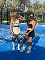 One of our best-selling designs, the monochrome two-piece padel/tennis top and skort in cream & black will give you an automatic WIN just for looking fire on court!