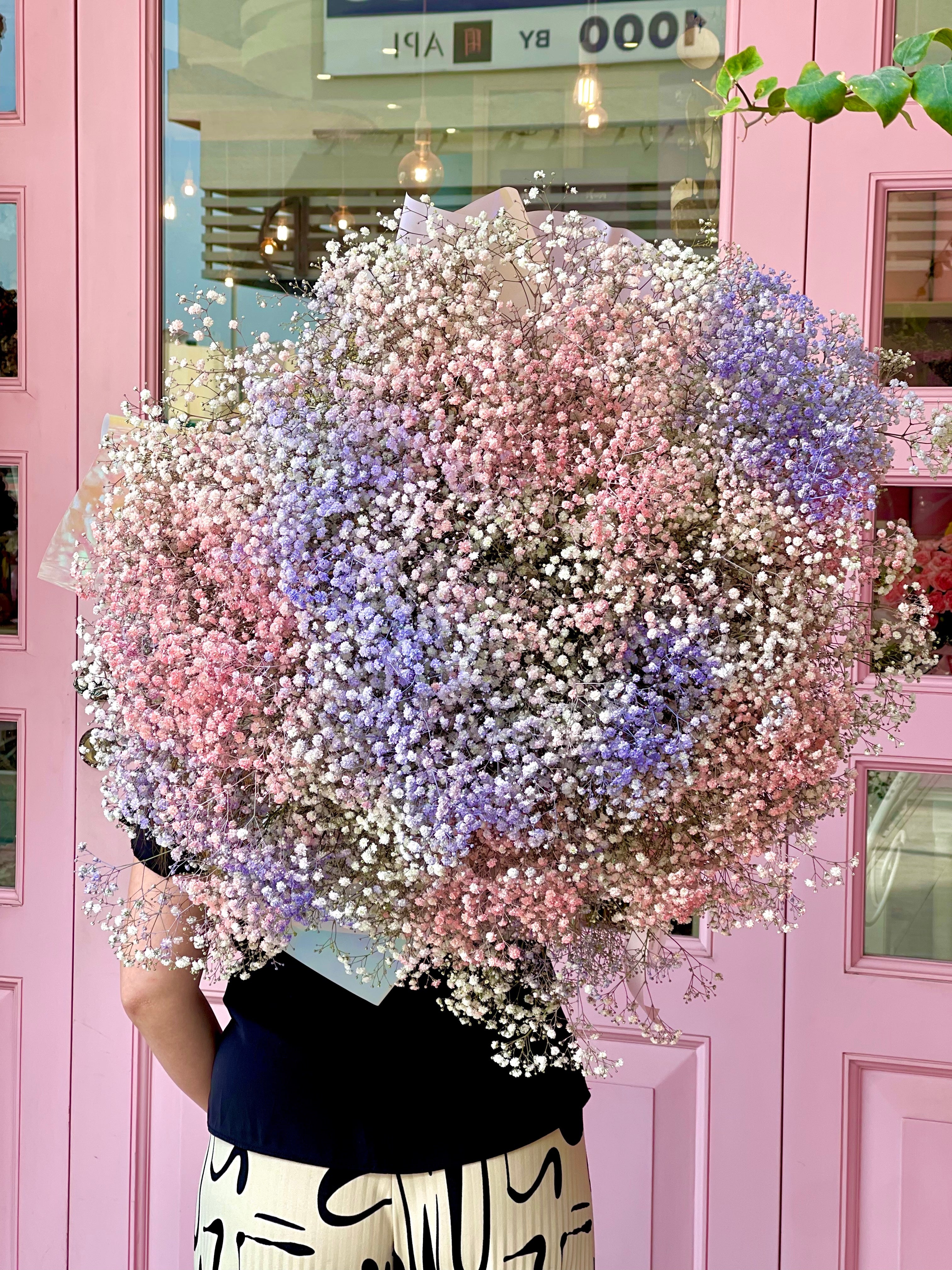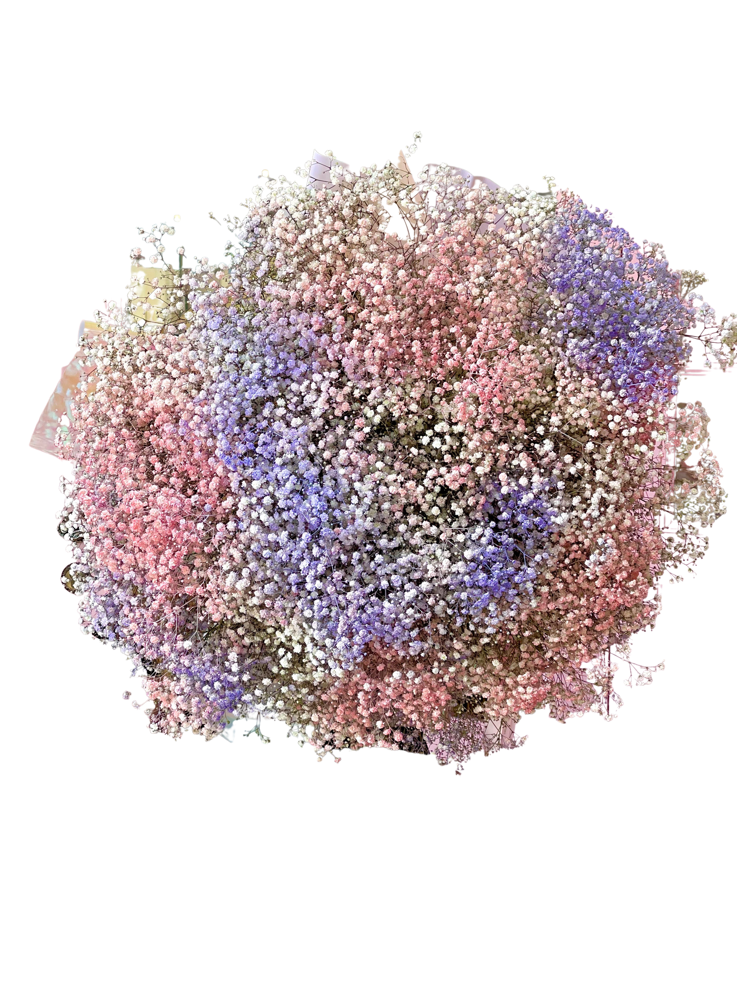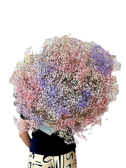 A massive Gypsophila bouquet in soft shades of Lilac, Pink and White making this special bouquet the talk of town! Your receiver will not only remember this bouquet for a long time, but can keep it for as long as they desire, as Gypsophila dries naturally and keeps its colours well. Long-lasting and unique, this huge bouquet is definitely something they won't soon forget.