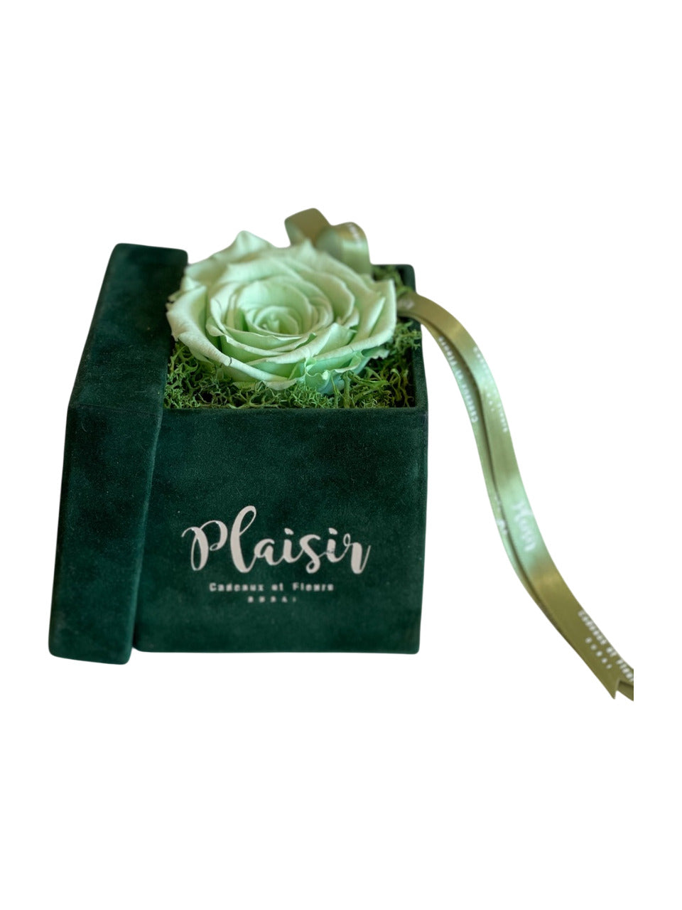 Plaisir Cadeaux et Fleurs' Petite Square Single Infinity box is a perfect gift that keeps on giving. Lasting for more than ONE YEAR without any water or care, this unique and beautifully displayed green forever rose in Plaisir's luxury olive velvet box will not only wow your receiver, it is also a testament of your elegant taste. Be it on their office desk or at home, you are sure to be remembered every day.