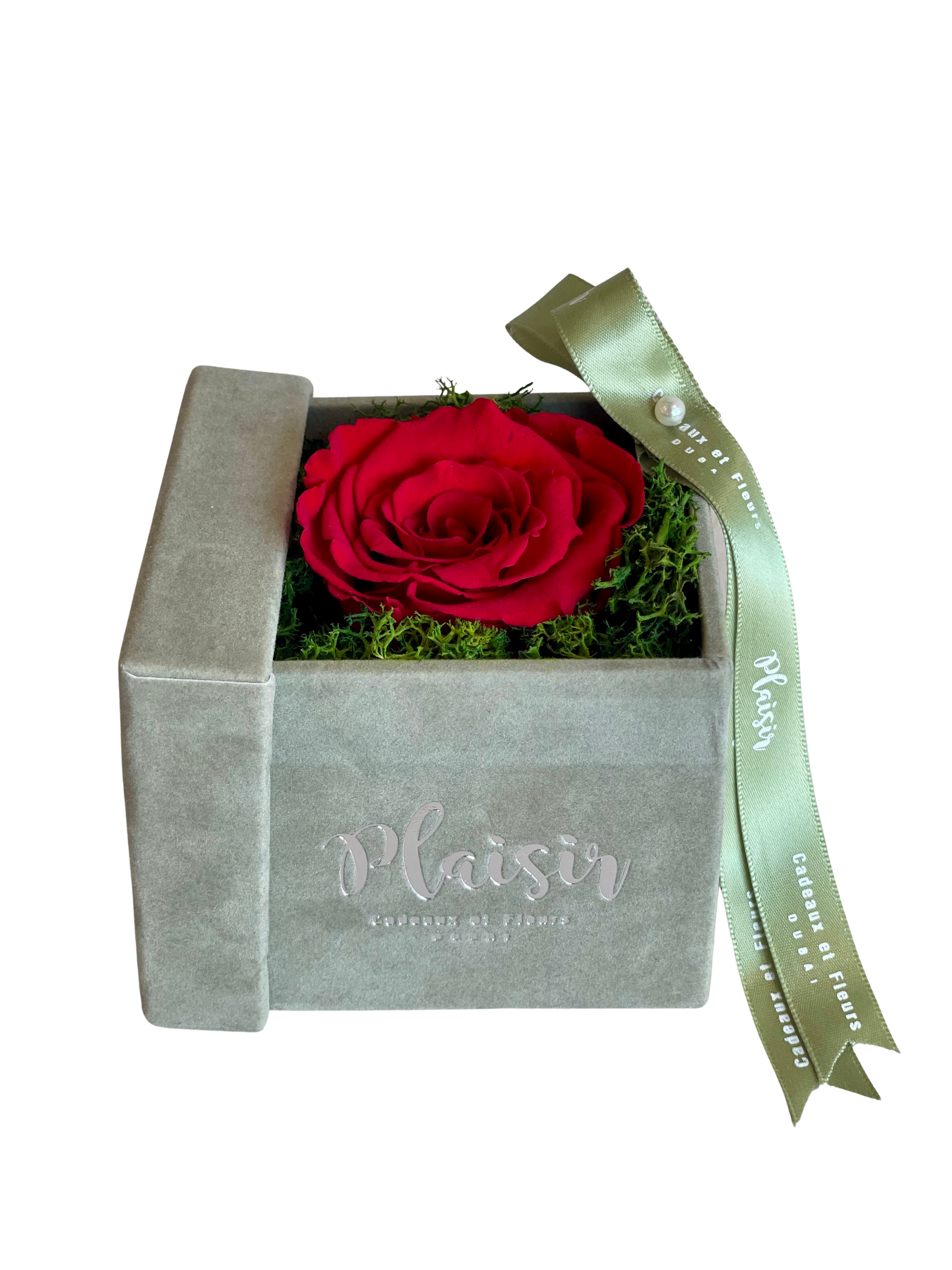 Plaisir Cadeaux et Fleurs' Petite Square Single Infinity box is a perfect gift that keeps on giving. Lasting for more than ONE YEAR without any water or care, this unique and beautifully displayed red forever rose in Plaisir's luxury olive velvet box will not only wow your receiver, it is also a testament of your elegant taste. Be it on their office desk or at home, you are sure to be remembered every day.