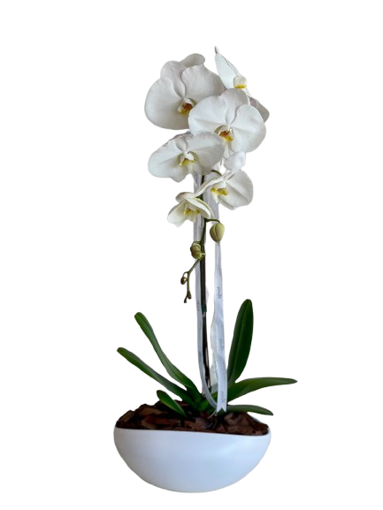 A gorgeous and luxurious single orchid, set in a uniquely designed white oval vase. A gift suitable for both ladies and gentlemen, home or office. Orchids are the most popular bloom to decorate any space!