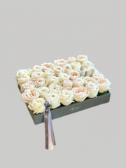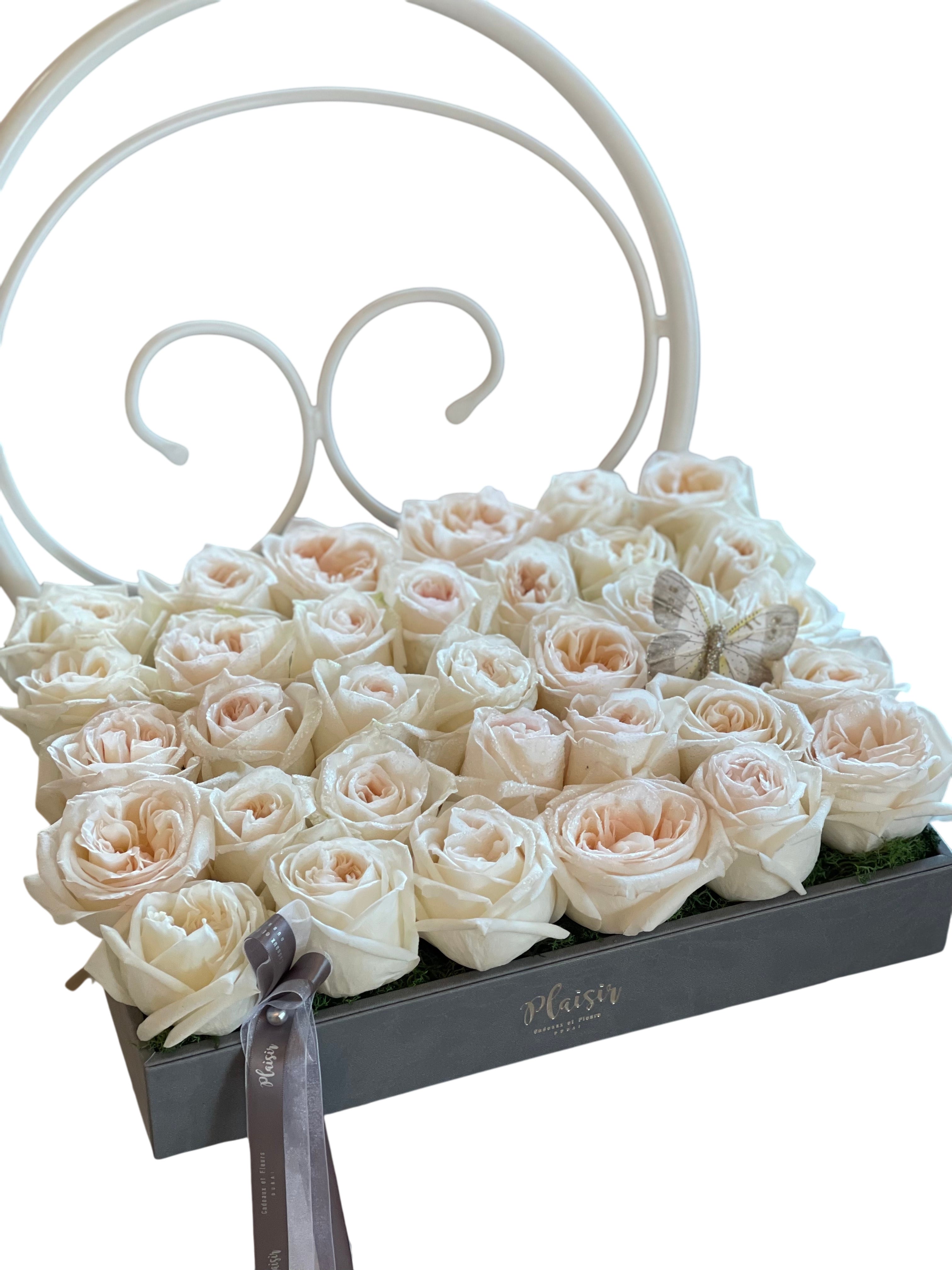 This stunning arrangement is the ultimate in floral sophistication. It features more than 30+ stunning fresh roses, accented by a delicate butterfly. Rose colours may be selected in White / Red / Pink. Be sure to select your rose colour preference before you checkout.The flat rose design is accented with Plaisir's silk and organza ribbons and housed in a glamorous, grey leather tray. This gorgeous arrangement is guaranteed to put a huge smile on your recipient’s face for days!