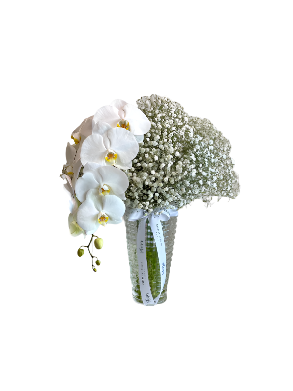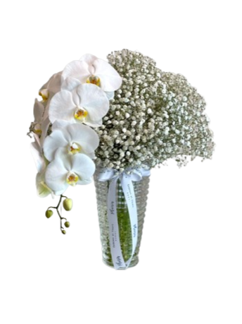 One of our bestselling floral items, the large Gypso and Orchid vase arrangement is a favourite of all no matter what the occasion may be. Trendy cloud-like Gypsophila blooms matched up with a luxurious orchid set in our elegant Criss Cut vase makes this exquisite arrangement one which is suitable for both men and women. Elegant and long lasting, this will convey your exquisite taste!