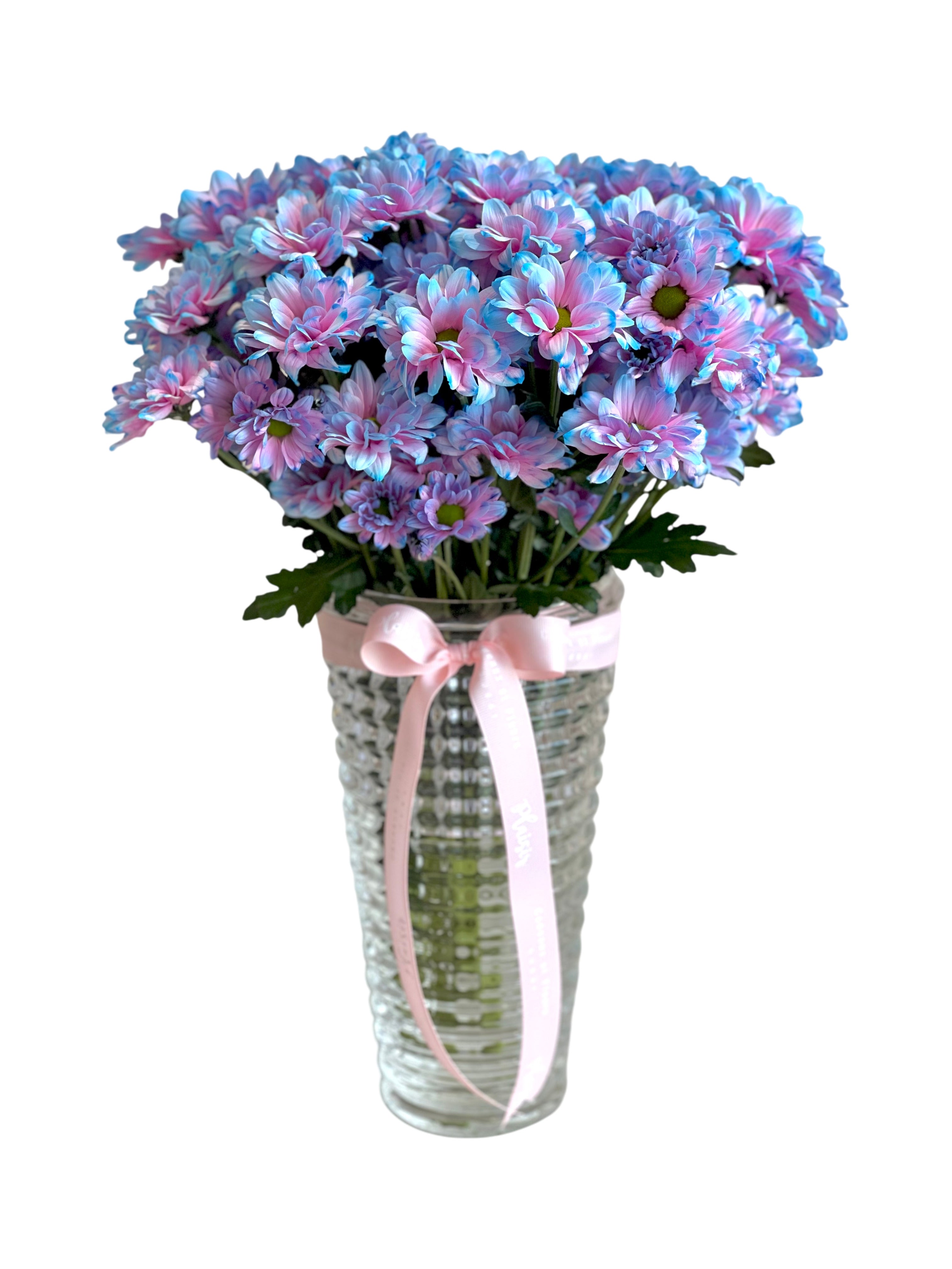 When it’s time to change the water (usually after 2-3 days or when you see the water getting a bit murky), re-cut stems at an angle and remove any leaves that may sit underneath the waterline when placed in a vase, as leaves in water create bacteria and shorten the life of your blooms. The removal of leaves from the stem also encourages water to go towards the flower head and keep your flowers hydrated for a longer period. For best results, display Chrysanthemums in cool shady spot. Avoid proximity to ripening fruit or positioning in direct sunlight.