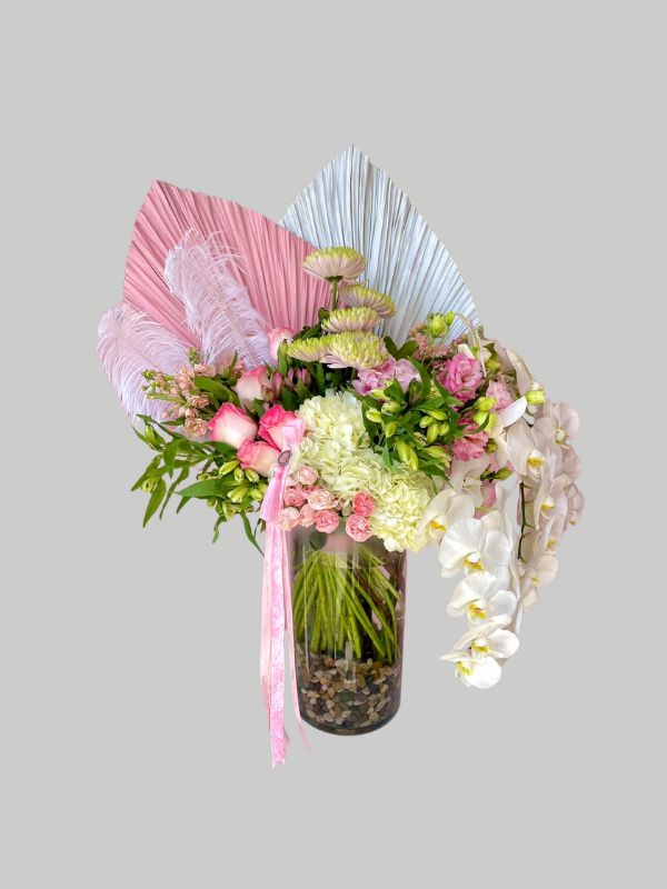 Roses Hydrangeas Orchids with Fans! An overwhelmingly luxurious vase arrangement consisting of a mix of White and Pink floral blooms along with elegant orchids to bring a sense of luxury to the arrangement. A duet of coloured fans add drama to this exquisitely luxurious arrangement. This is an arrangement to truly wow your receiver...For maximum impact, say it with Plaisir!