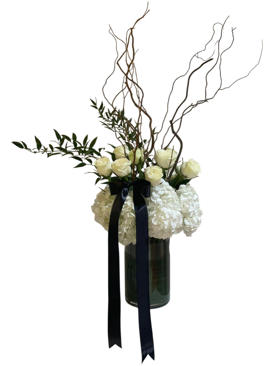 White Roses and Hydrangeas. There are times we wish to share our friends or relatives’ pain in losing a loved one but there isn’t much we can offer other than peace. This beautifully presented arrangement of traditional White Lilies, Hydrangeas and Roses decorated with the necessary black ribbon to convey deep sympathy, is a peaceful and serene way you can show your sincere sympathy for their loss. White flowers are known to convey support and have a calming affect in difficult times.