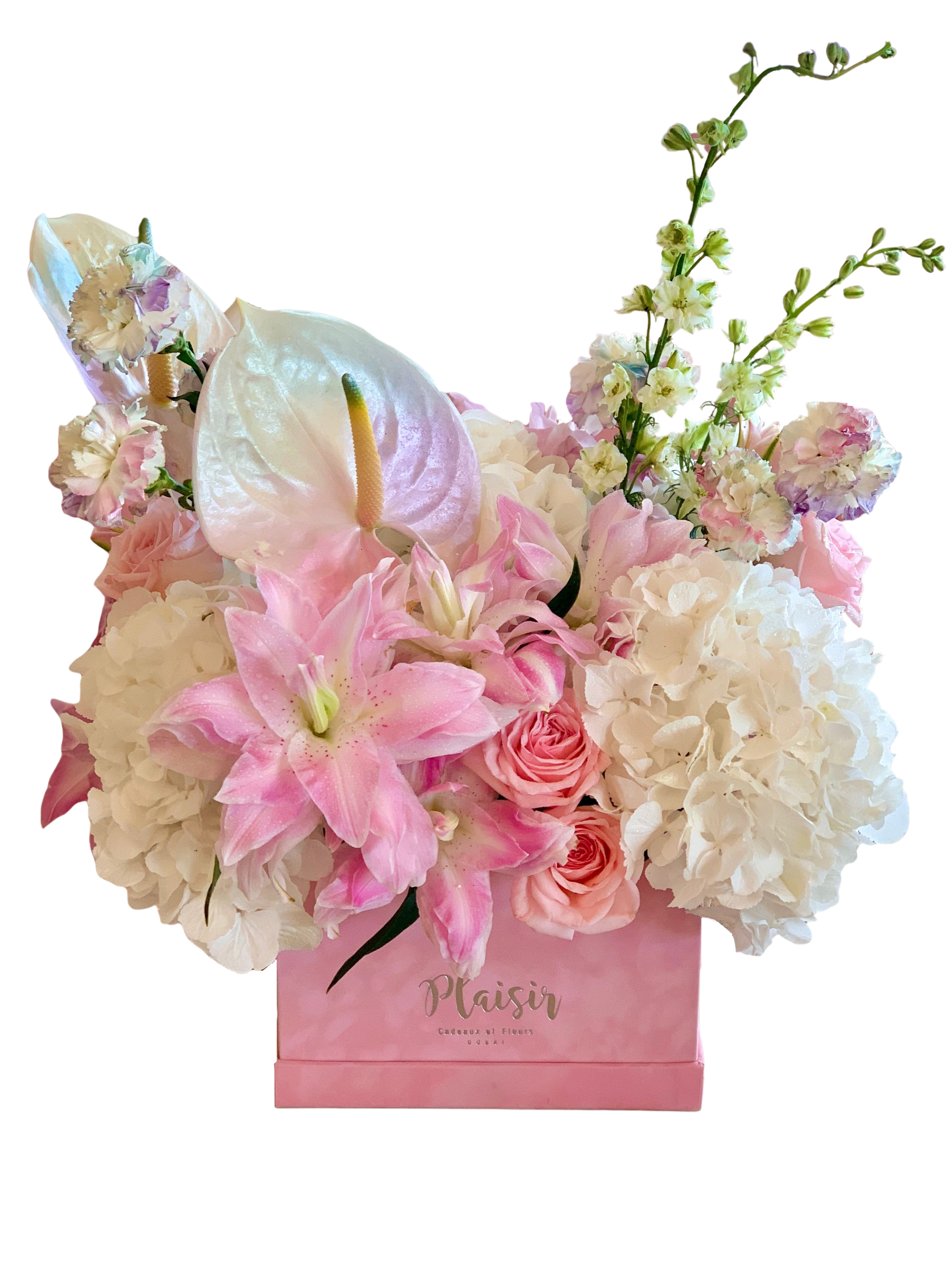 Plaisir Cadeaux et Fleurs' Unicron Love arrangement is a feast for the eyes! Set in our luxurious hand-crafted velvet (20x20 cm) box, an array of soft pink and white blooms turn this gorgeous arrangement into flower couture. Pastel anthuriums shine atop while silk ribbons and cameo perfectly tie up the luxurious finishing touches. Surprise someone special today!
